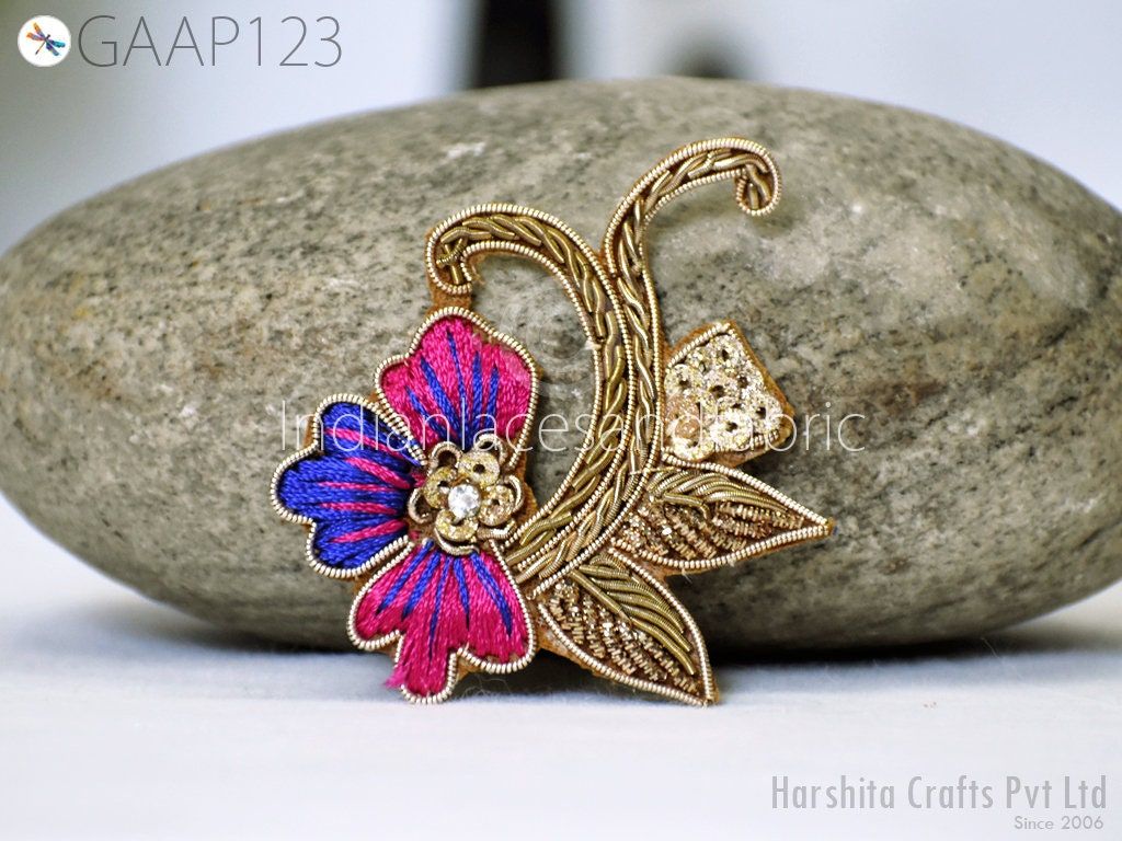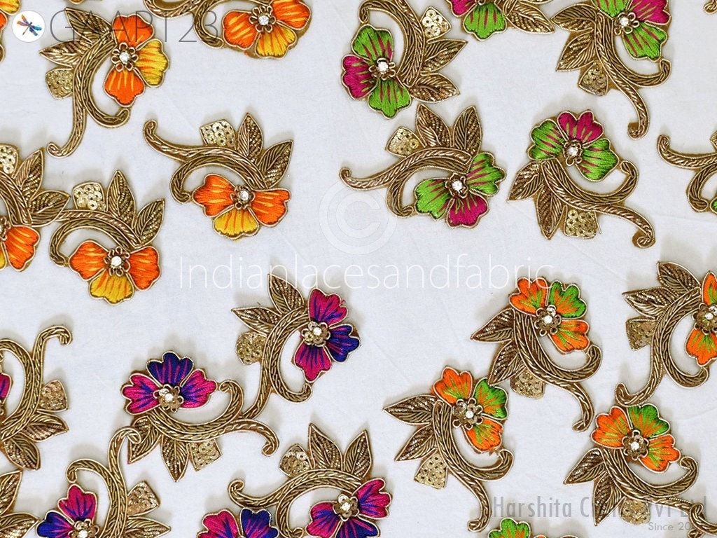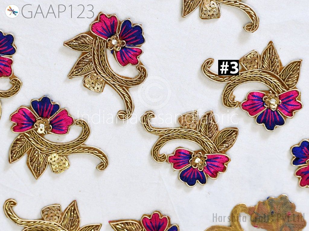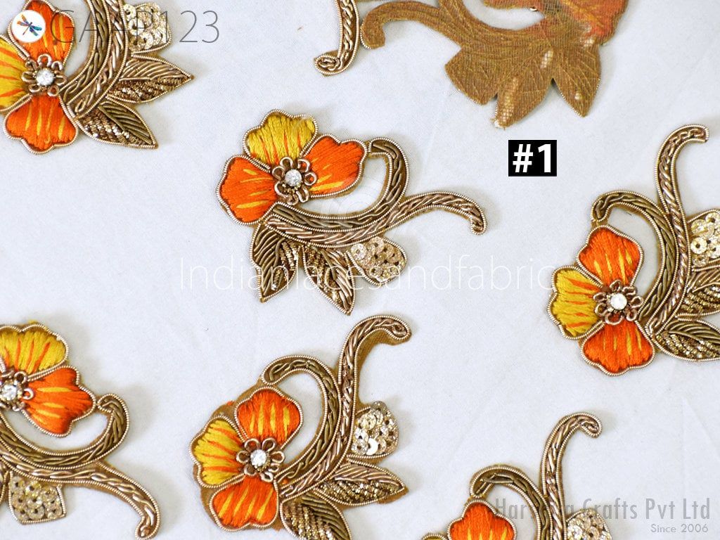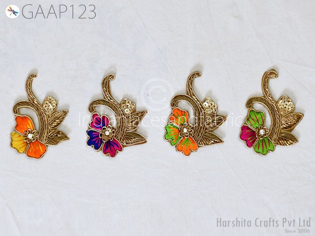 10 Piece Gold Appliques are extremely beautiful applique (sew on applique or you can paste it on fabric) which gives the exclusive look. Each of them is decorated with Zardozi work, Silk Thread work to make it a perfect piece for Sewing Accessories, Summer Dress, Handbags, Wall Hanging, Tudor kirtle, pets band, Arts and Crafts etc.