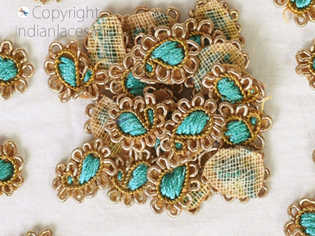 This Appliques are extremely beautiful applique (sew on applique or you can paste it with fabric glue) in Blue and golden finish which gives the exclusive look. Each of them is decorated with Zardozi work, Thread work to make it a perfect piece for embellishing a wedding dress, Wedding Skirt or a sari.
