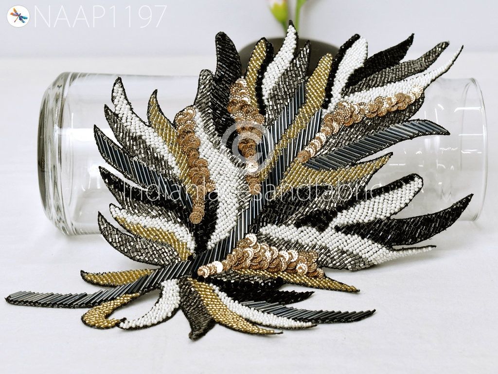 Beaded Designer Appliques in White, Grey, Gold and Black color are extremely beautiful applique (sew on applique or you can paste it with fabric glue) in golden finish which gives the exclusive look. Each of them is decorated with Beads work to make it a perfect piece for embellishing a wedding dress, Wedding Skirt or a sari.