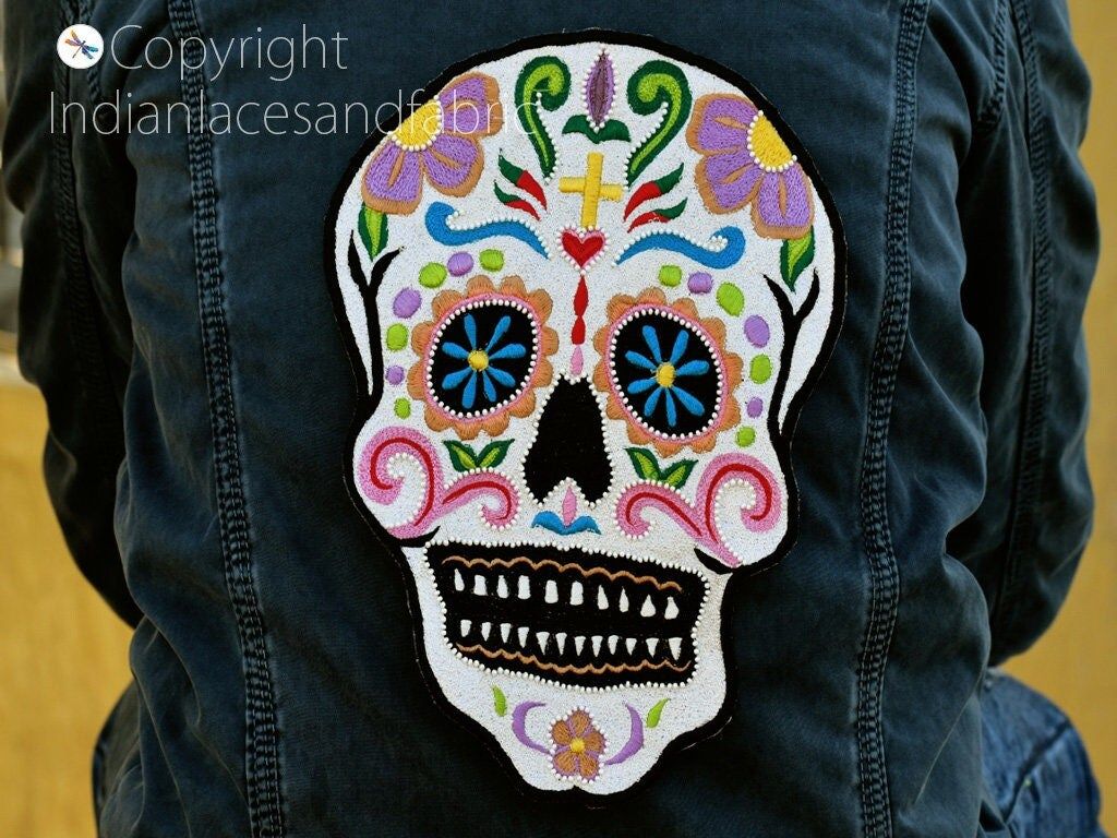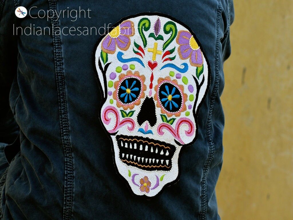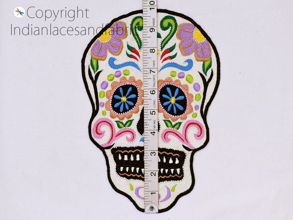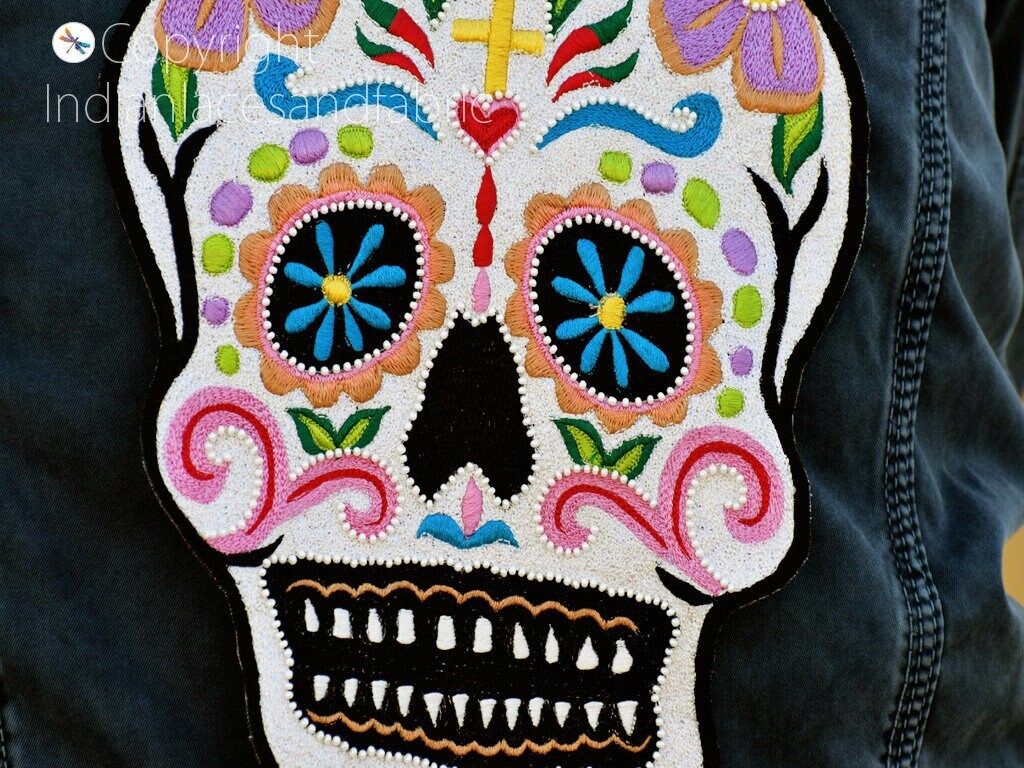 Skull 10 inch Patch for Denim Jackets are extremely beautiful applique (sew on applique or you can paste it with fabric) in Embroidery which gives the exclusive look. Each of them is decorated beaded with Thread work to make it a perfect piece for embellishing a wedding dress, Wedding Skirt or a sari.
