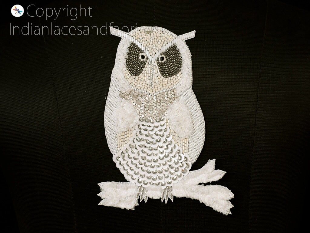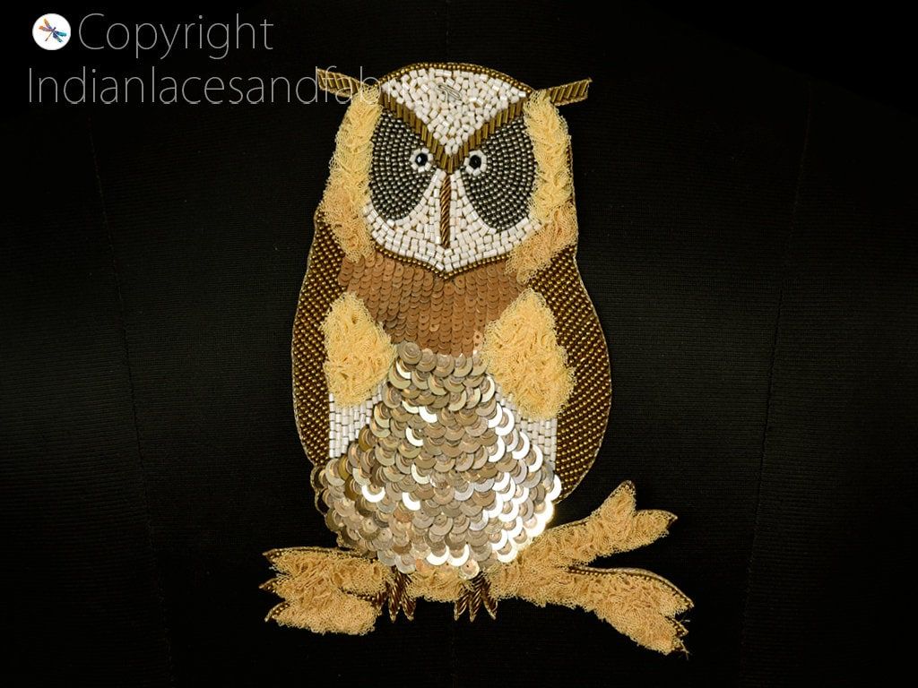 3 pcs Handmade Beaded Owl Applique Patch: Embroidered Indian Style (6.5 Inch)