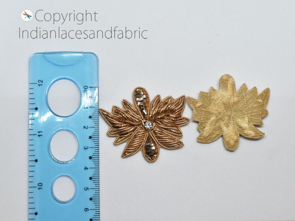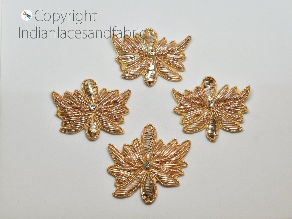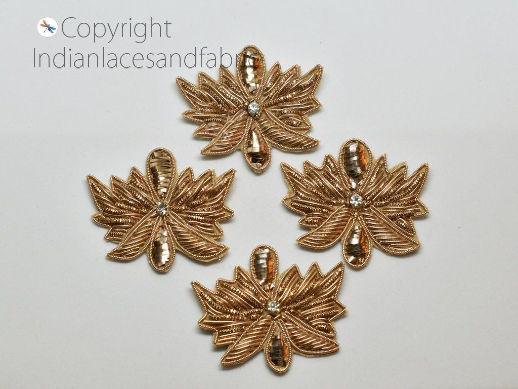 Indian Patches Appliques extremely beautiful sew on applique in Golden finish. Each of them is decorated with layers of rhinestones, Zardozi work, Zari Thread at the center to make it a perfect piece for embellishing a wedding dress, Wedding Skirt or a sari.