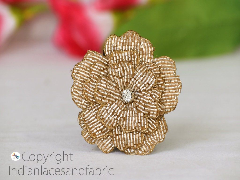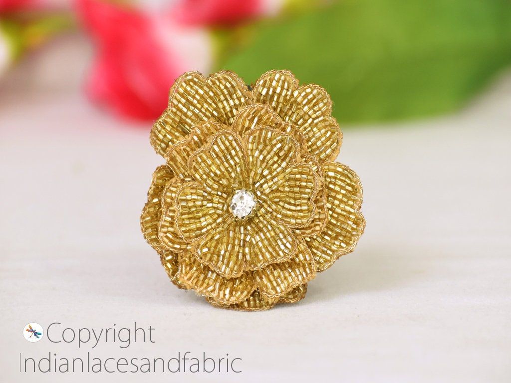 3 Pair Gold 3D Beaded Flower Decorative Handmade Patches Lotus Embroidered Indian Sewing Thread Dresses Handcrafted Patches Appliques Crafting Supply Bags, Leaf Indian, Patches Appliques, Christmas applique, Applique for dress, Headband Applique, applique designs, Handcrafted Appliques, Scrap booking Appliques