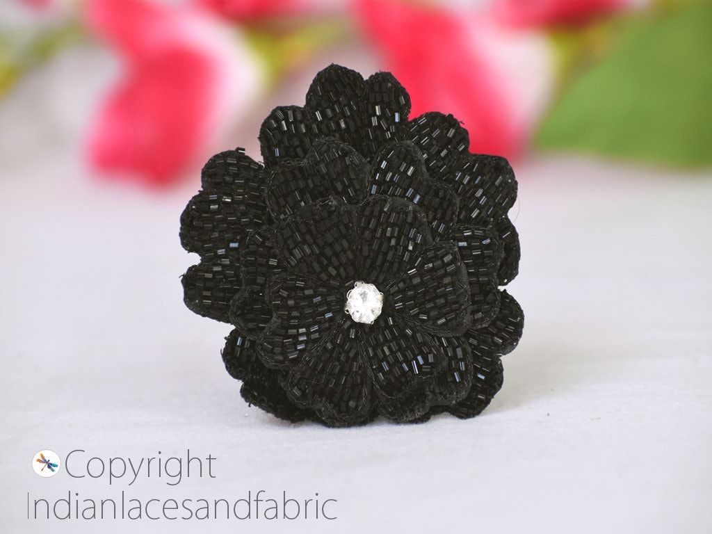 3D Beaded Flower Appliques: Gold, Black, Silver Handmade Patches (6 Pcs)