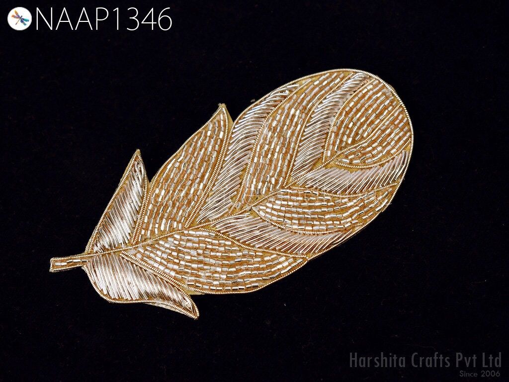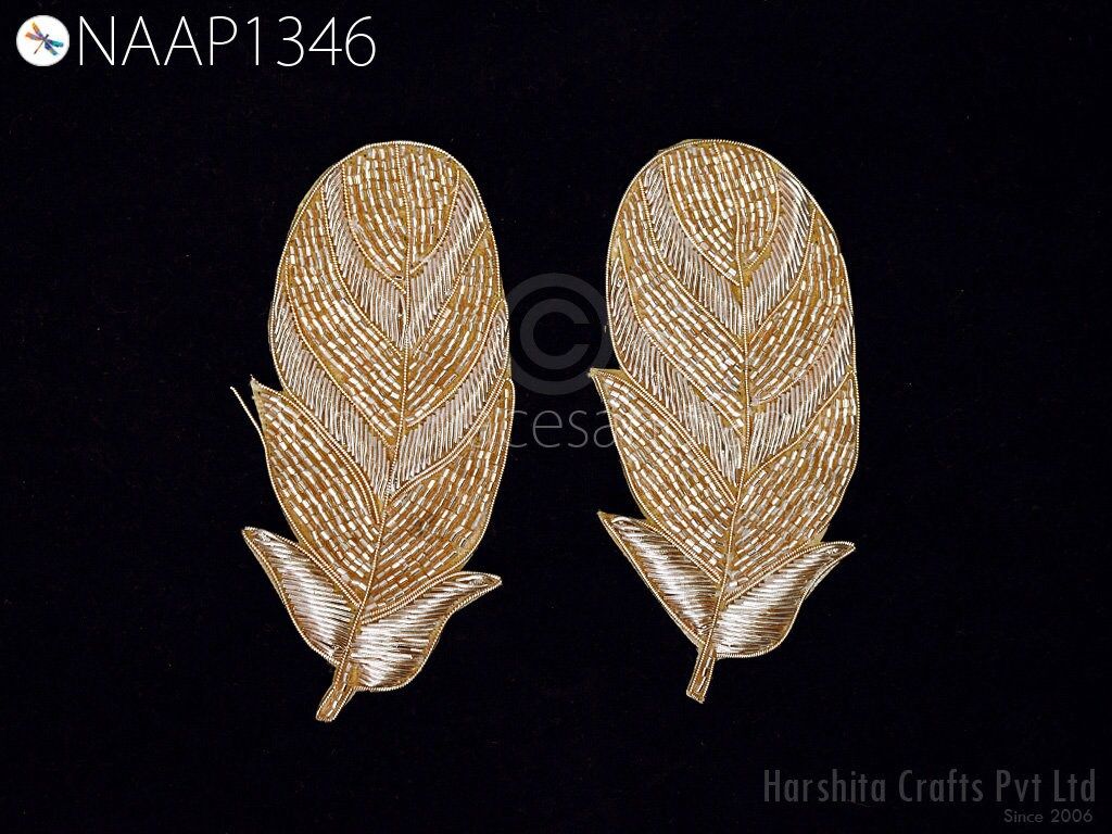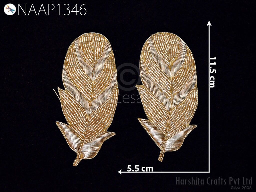 4 Pieces of Feather Design Appliques in Rose Gold Color are extremely beautiful applique (sew on applique or you can paste it with fabric) in Embroidery which gives the exclusive look. Each of them is decorated Bugle beads with Zari Thread work to make it a perfect piece for embellishing a wedding dress, Wedding Skirt or a sari.