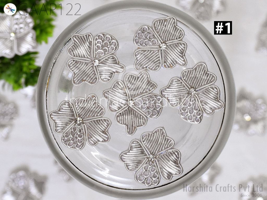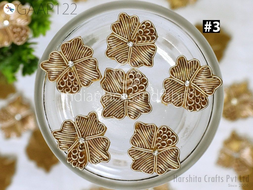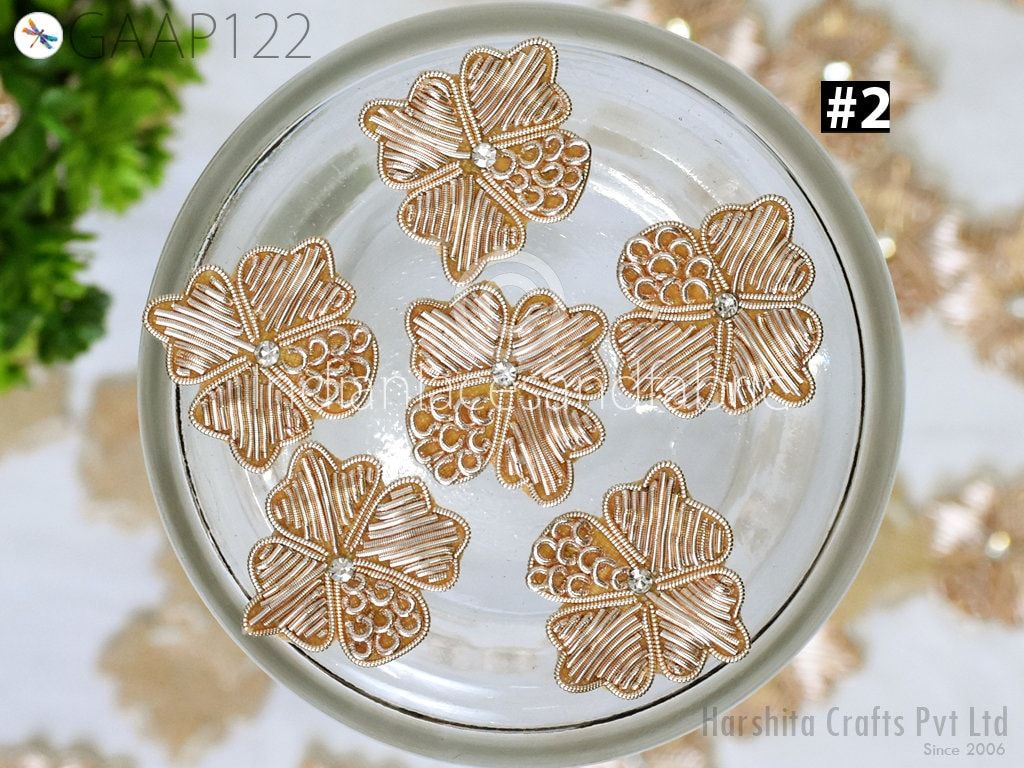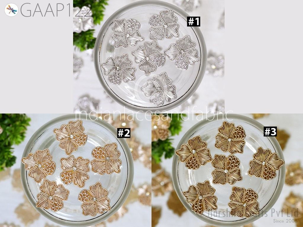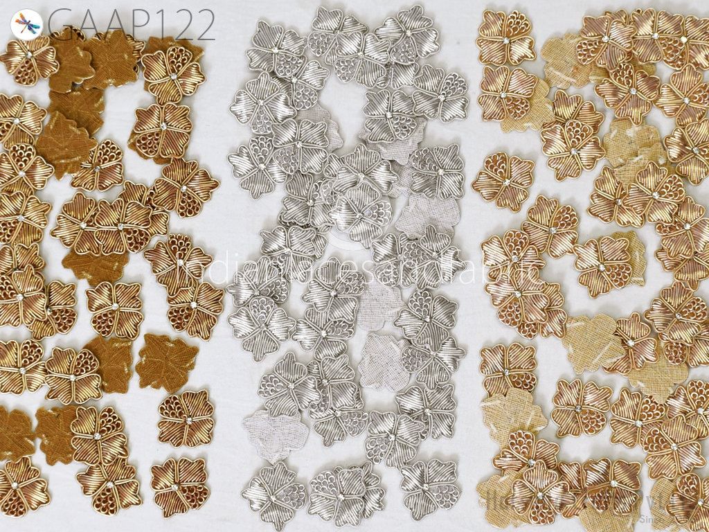 40 Pc Zardozi Embroidered Flower Appliques (3 cm): Indian Sewing Embellishments Antique Gold, Silver, Rose gold