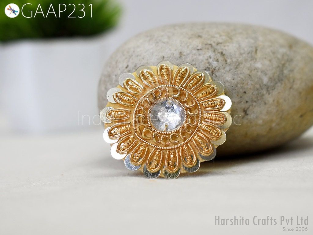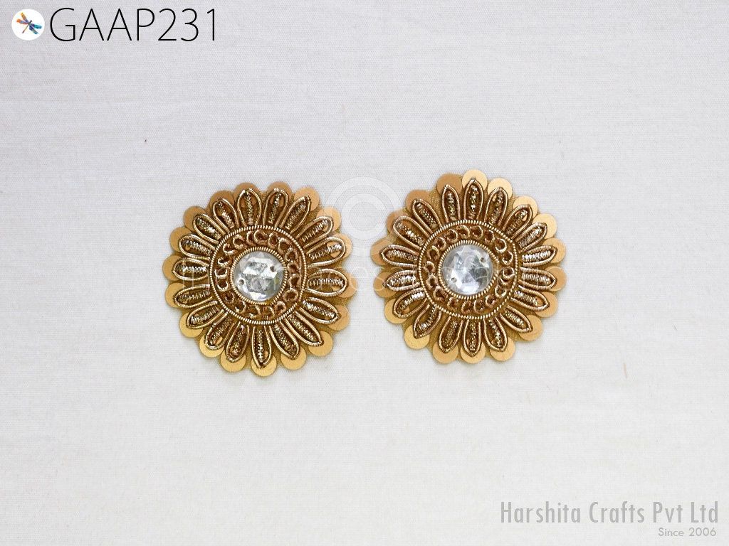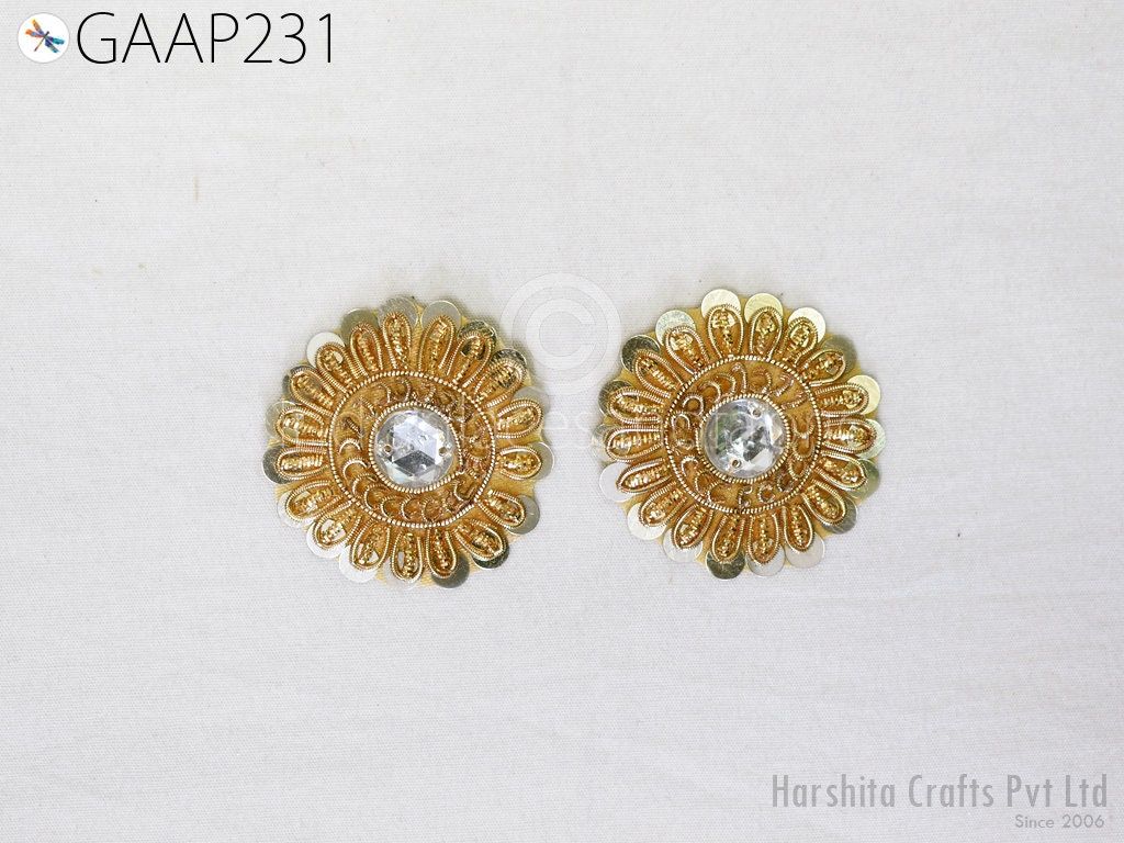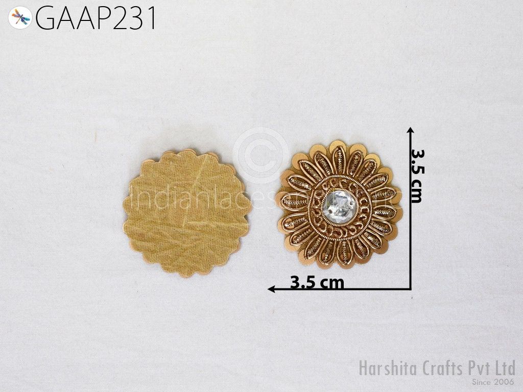 Small Round Design Appliques extremely beautiful sew on applique. Each of them is decorated with rhinestones, Zardozi work and Zari Thread to make it a perfect piece for embellishing a wedding dress, Wedding Skirt or a sari. Bridal Belt, Sari, Dresses, Cushion Covers, Headbands making, hats, gown, Purse etc.
