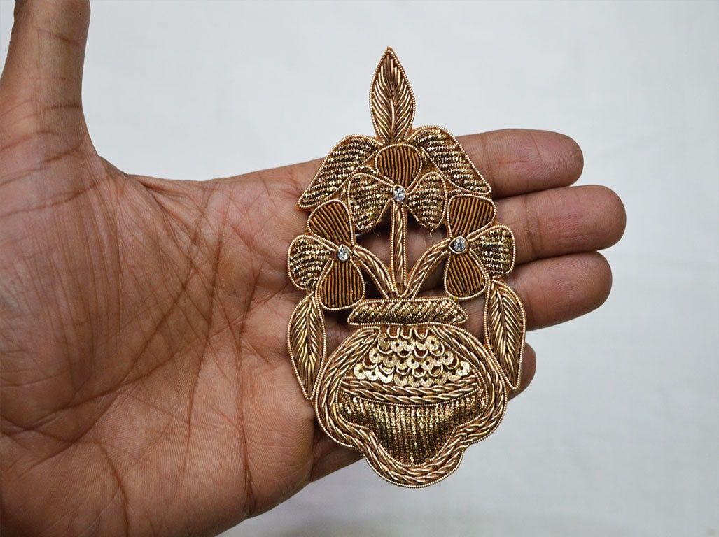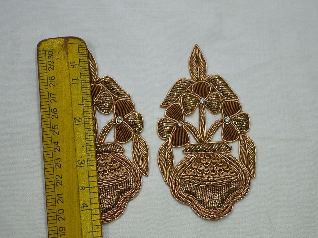 5 Pieces Appliques in Gold Color are extremely beautiful applique (sew on applique or you can paste it with fabric glue) in golden finish which gives the exclusive look. Each of them is decorated with Zardozi work, Silk Thread work to make it a perfect piece for embellishing a wedding dress, Wedding Skirt or a sari.