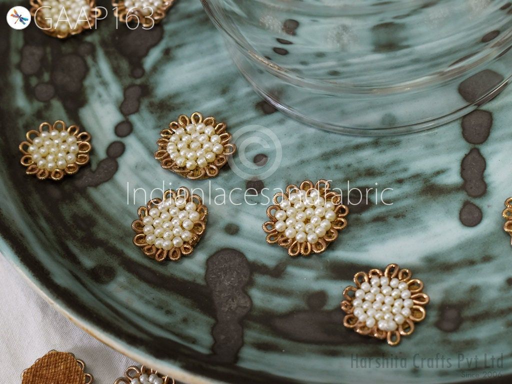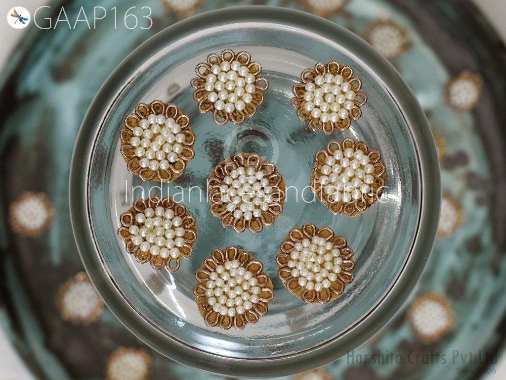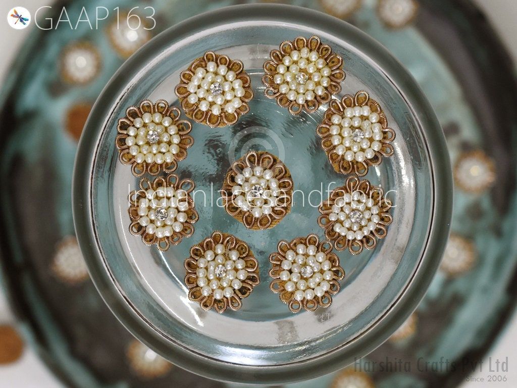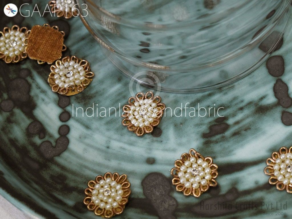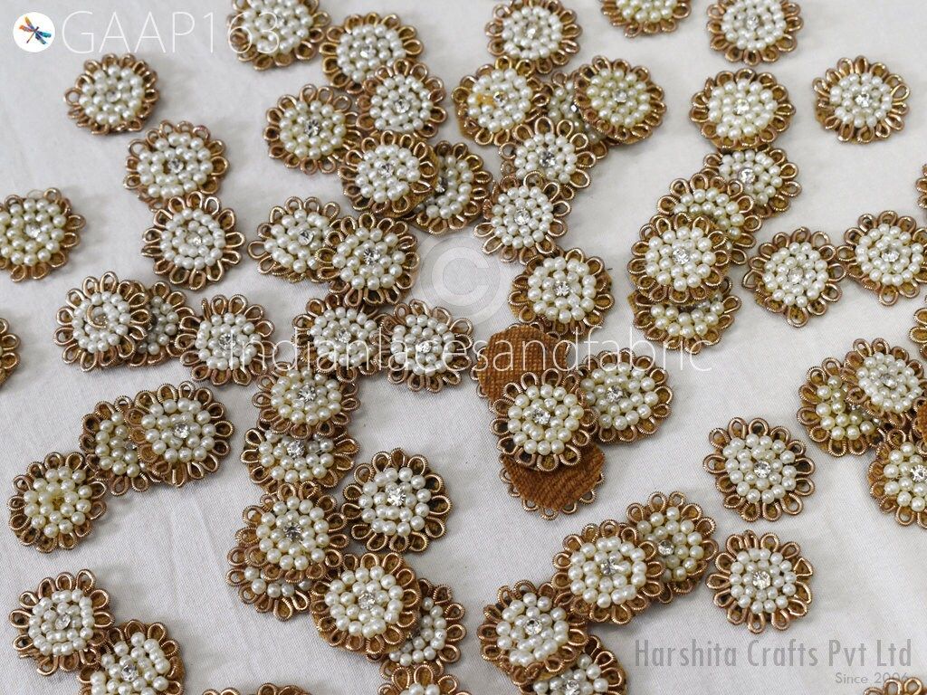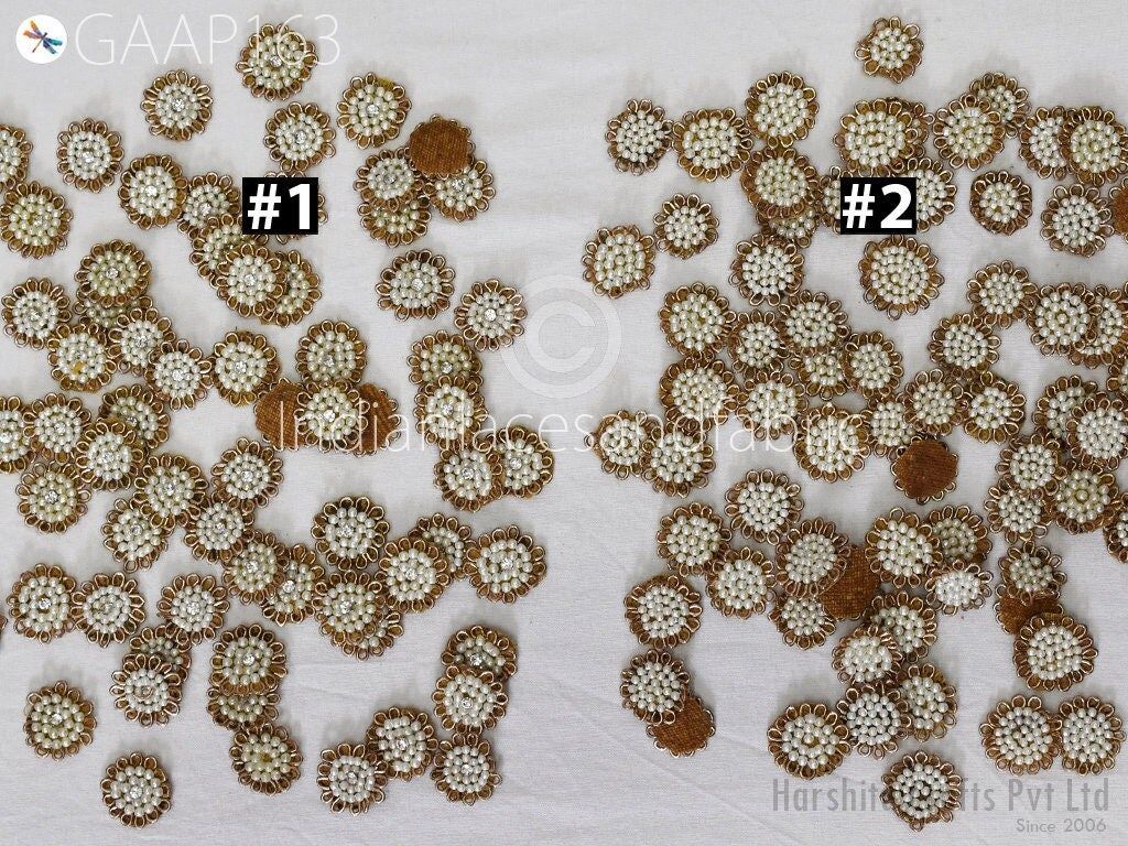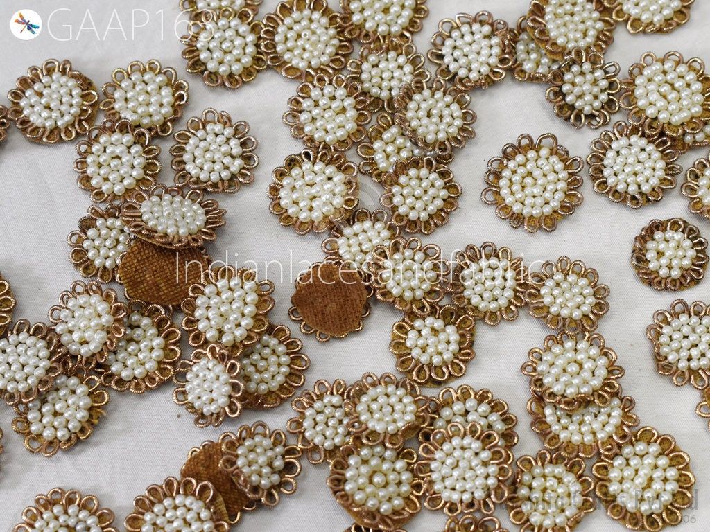 50 Handmade Rhinestones Beads Small Appliques are extremely beautiful applique (sew on applique or you can paste it with fabric) in Embroidery which gives the exclusive look. Each of them is decorated with Thread work to make it a perfect piece for embellishing a wedding dress, Wedding Skirt or a sari.