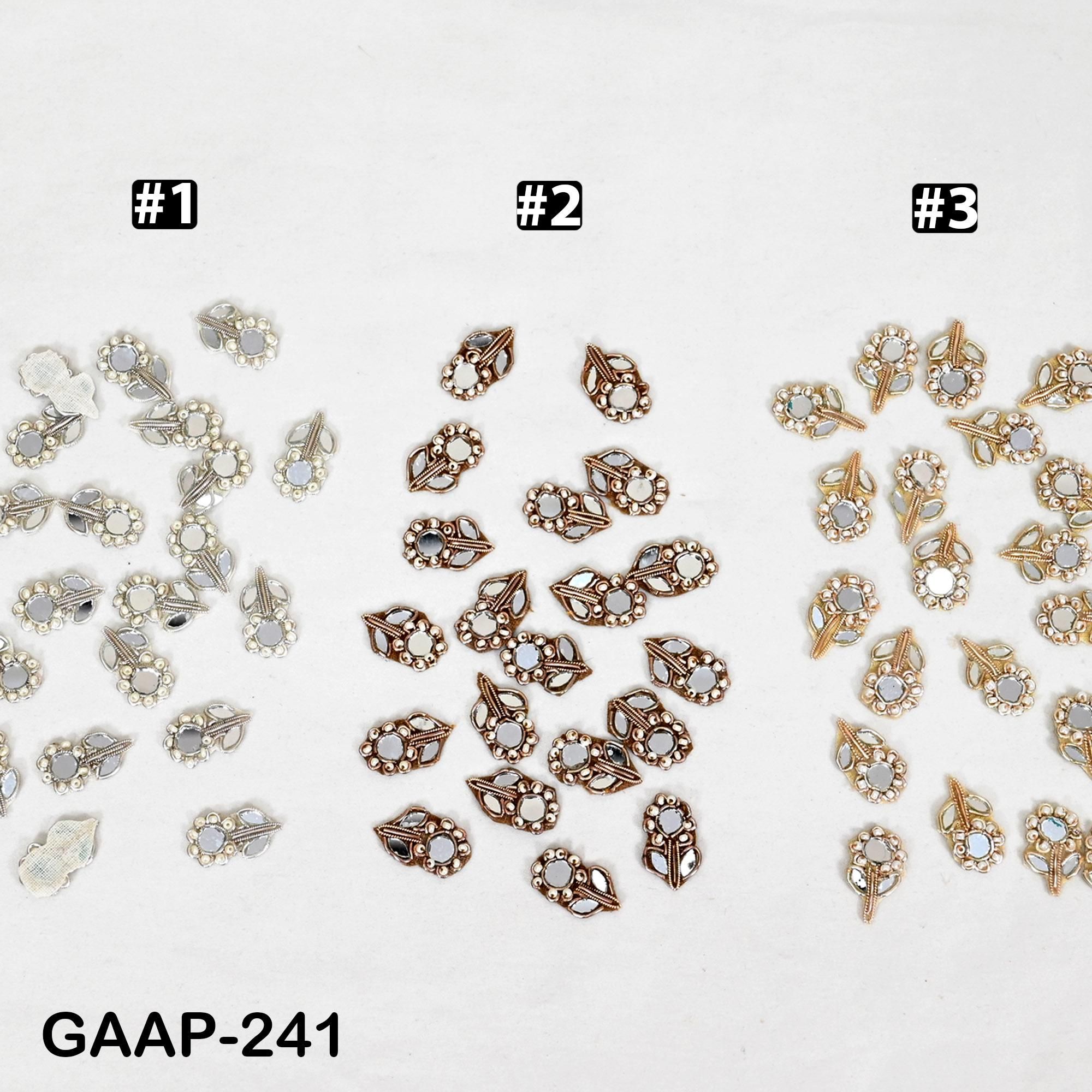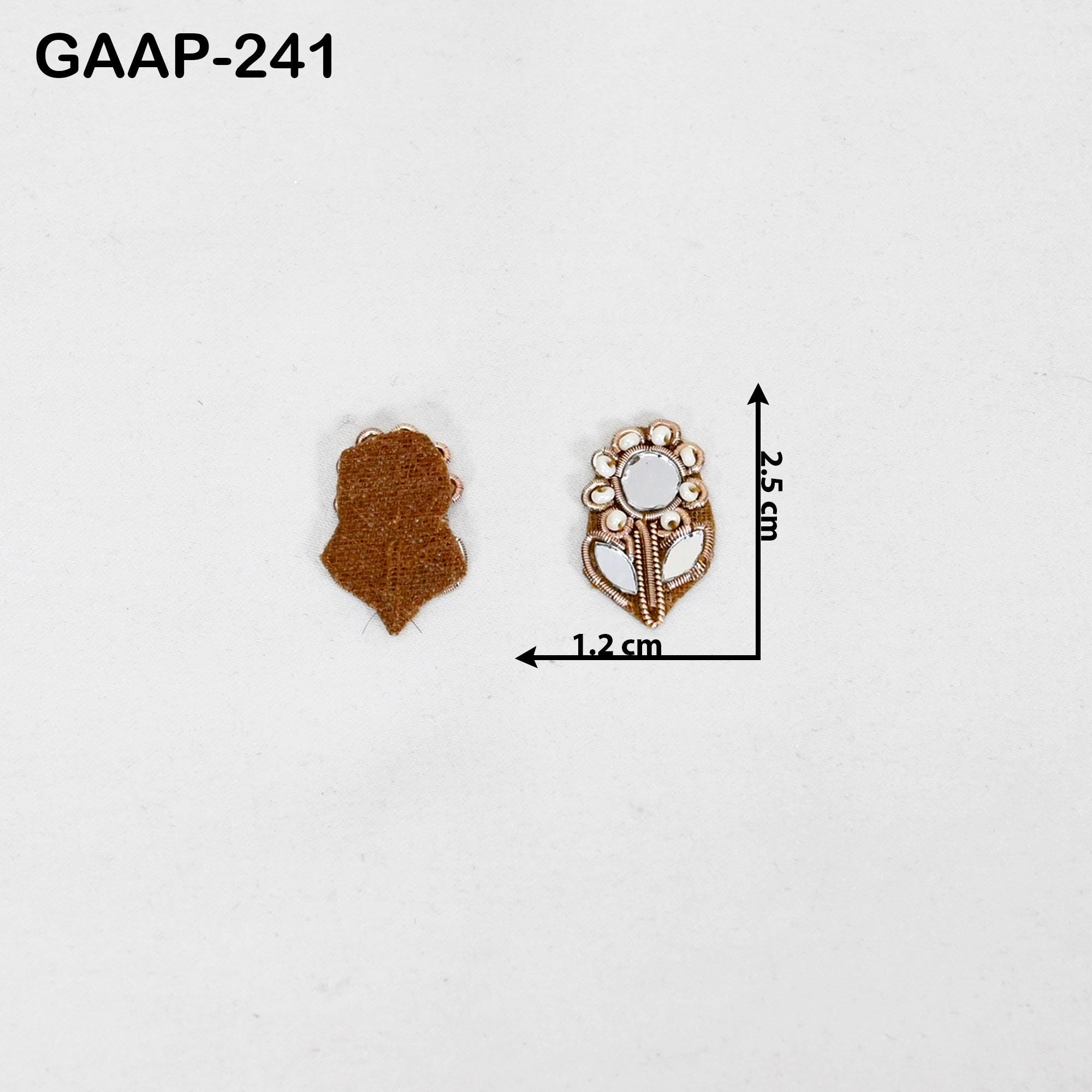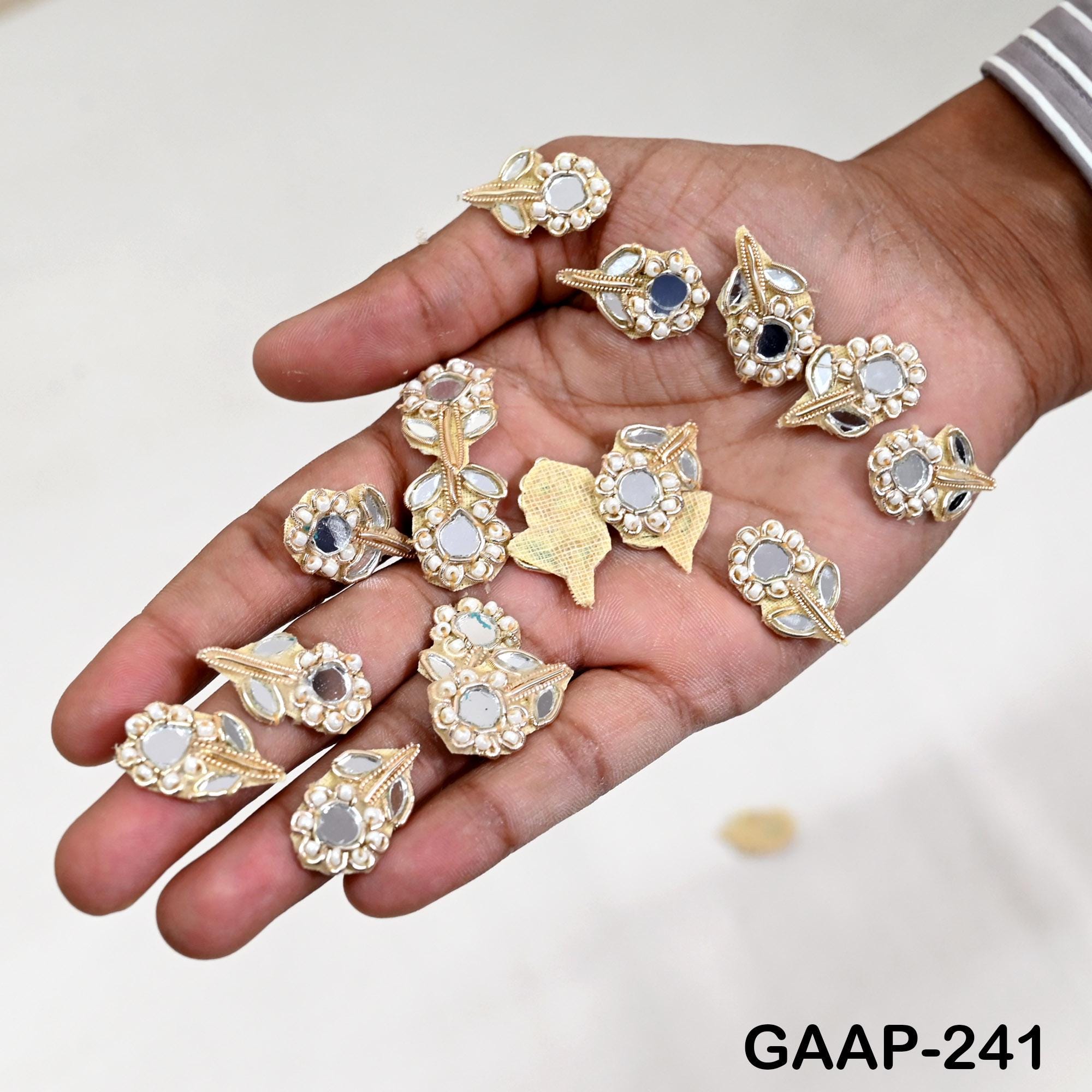 Give your artistic projects a dash of sparkle and sophistication with these handmade Kundan mirror embellishments in Flower shape (GAAP-241) beautiful sew-on applique. Every item decorated with Fine Mirror work, pearl beading, and gold-colored detailing — make it a perfect piece for embellishing a traditional attire, accessories, and home decor. Bridal Belt, Sari, Dresses, Cushion Covers, Headbands making, hats, gown, Purse etc.