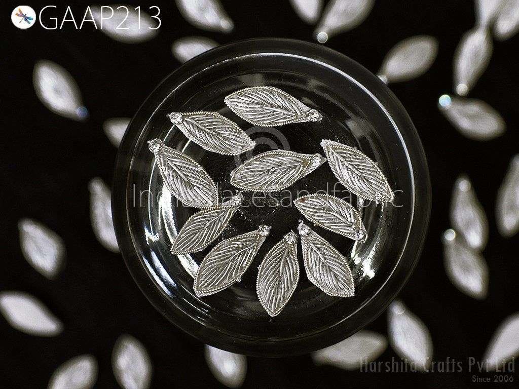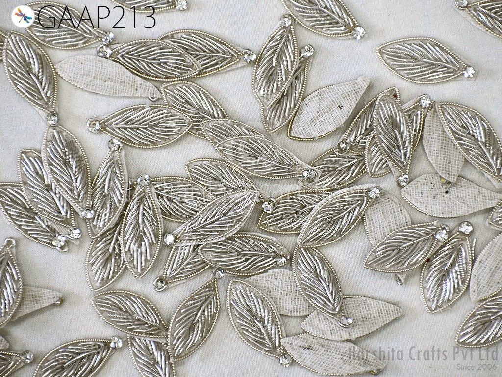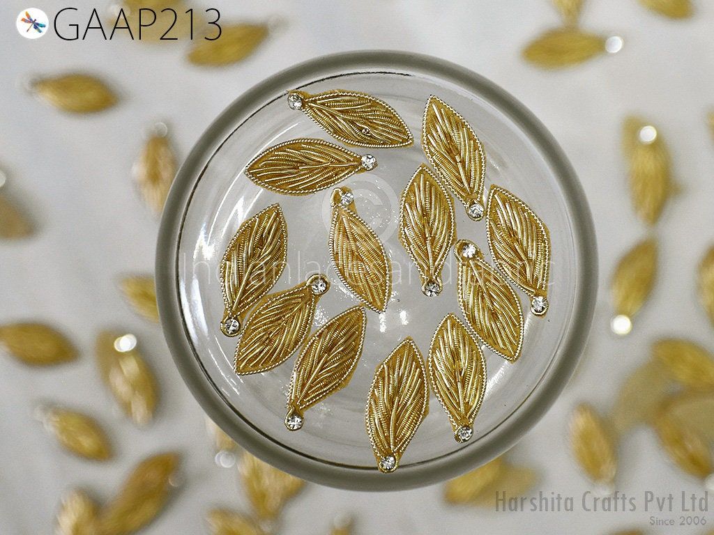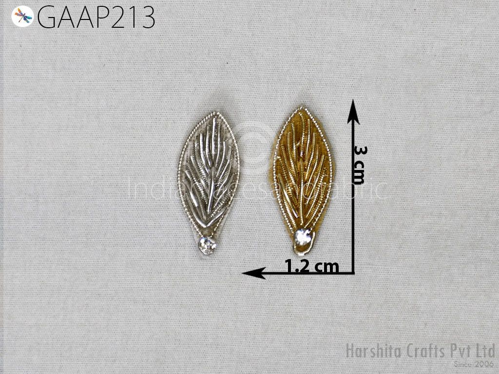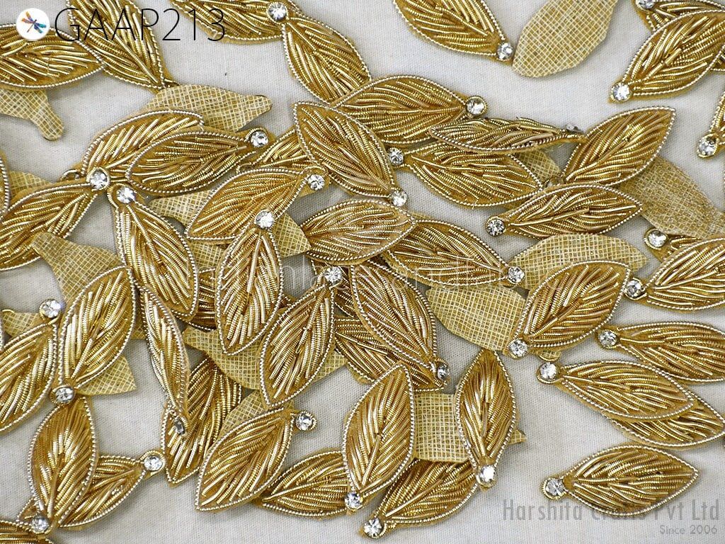 Elevate your creations with this set of 50 handcrafted Zardozi leaf appliques. Measuring approximately 3 cm (1 inch) each, these intricate patches feature traditional Indian embroidery adorned with bugle beads, adding a touch of elegance to any project.
