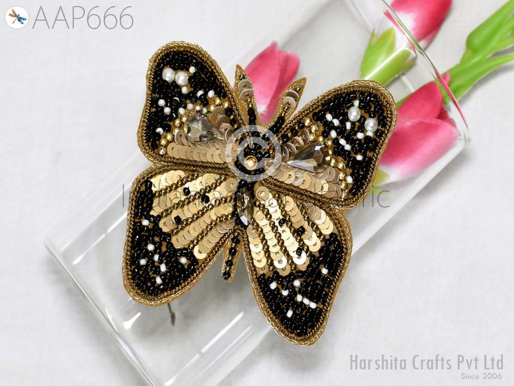 6 pcs, 3 inches Butterfly Appliques in Bronze, Black Color are extremely beautiful applique (sew on applique or you can paste it with fabric) in hand Embroidery which gives the exclusive look. Each of them is decorated with Beads and sequin work to make it a perfect piece for embellishing a Dance Costume dress, Denim, Tops Blouse or a sari.