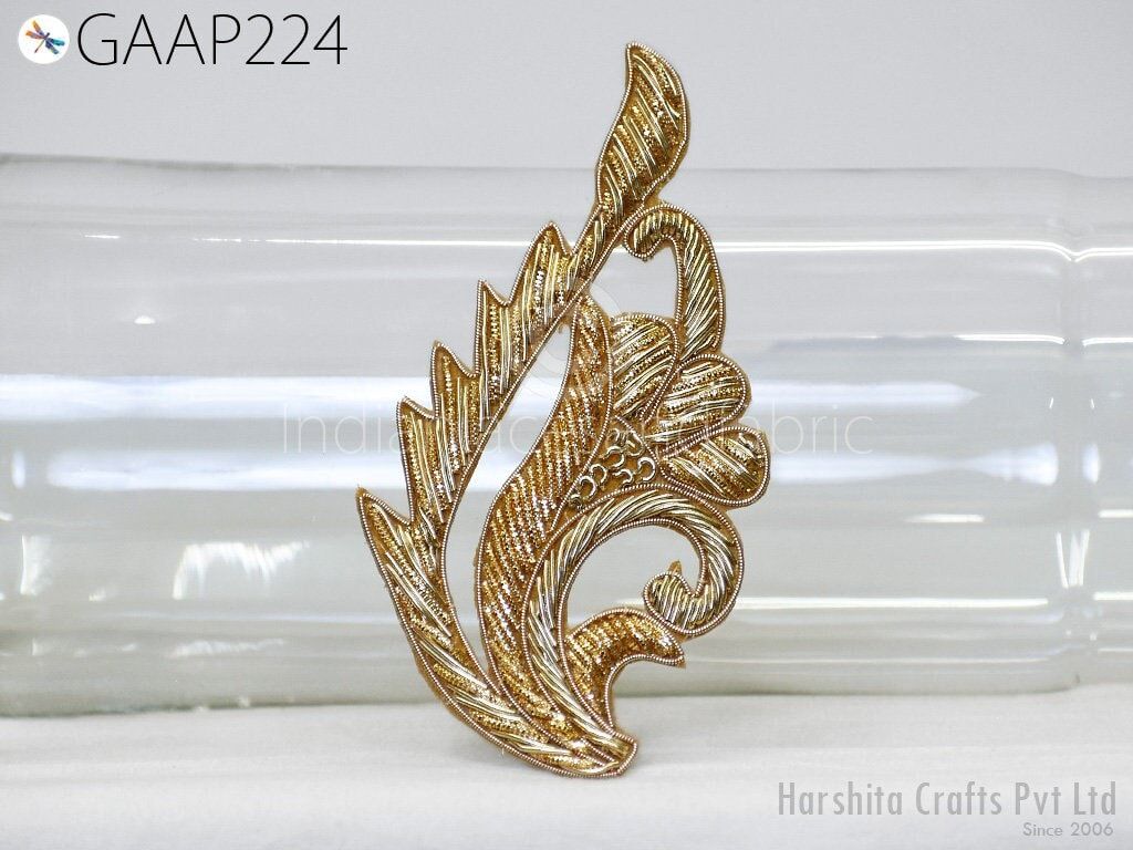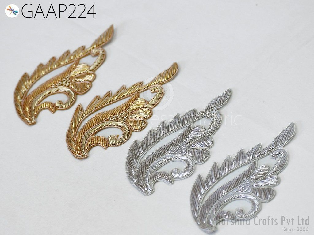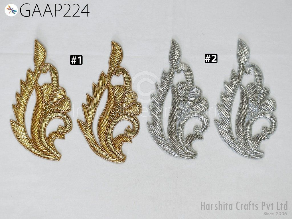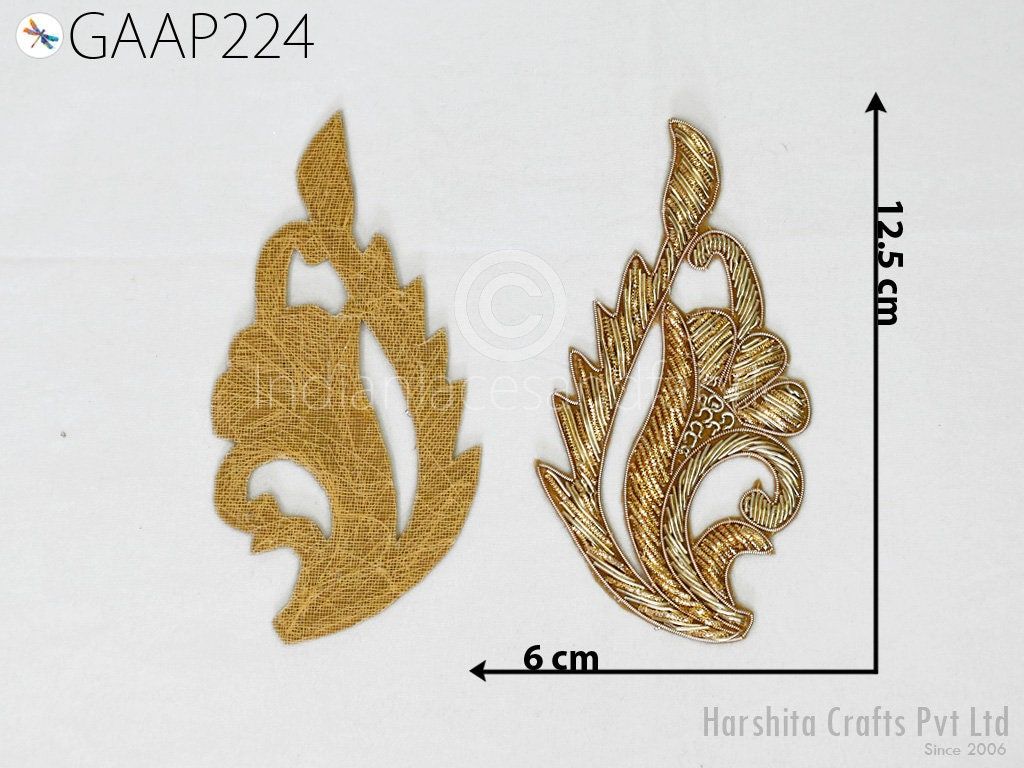 6 Pieces (3 Pair) Appliques in Gold Color are extremely beautiful applique (sew on applique or you can paste it with fabric glue) in golden finish which gives the exclusive look. Each of them is decorated with Zardozi work, Silk Thread work to make it a perfect piece for embellishing a wedding dress, Wedding Skirt or a sari.