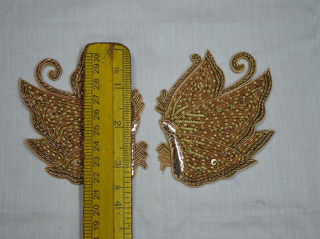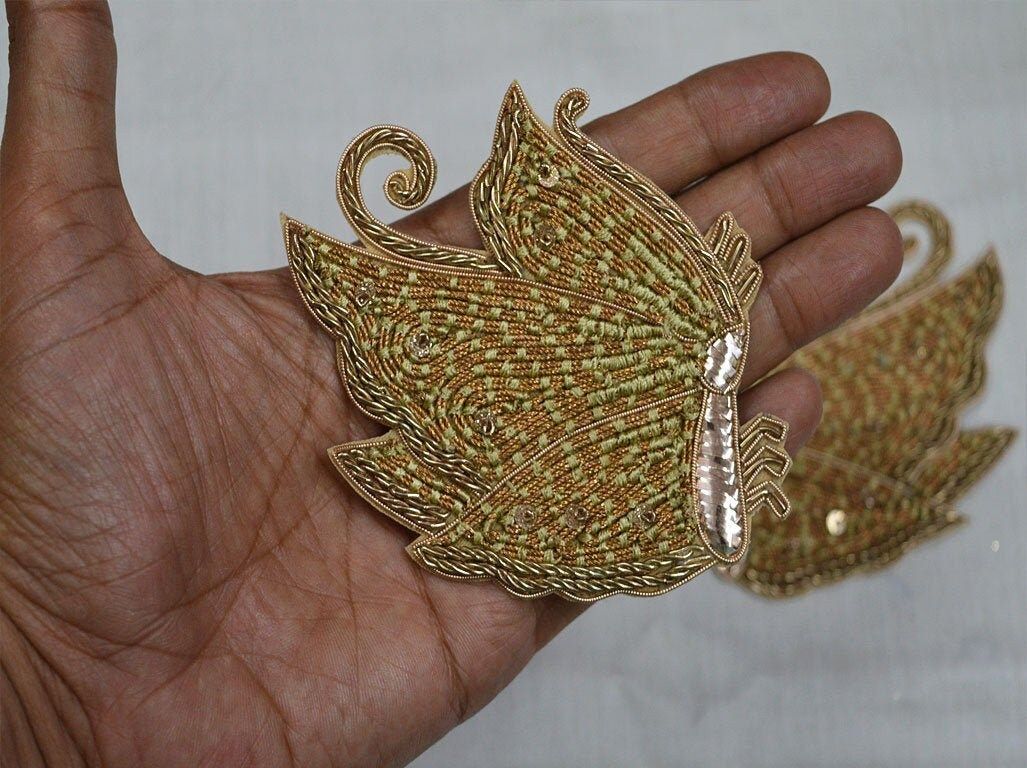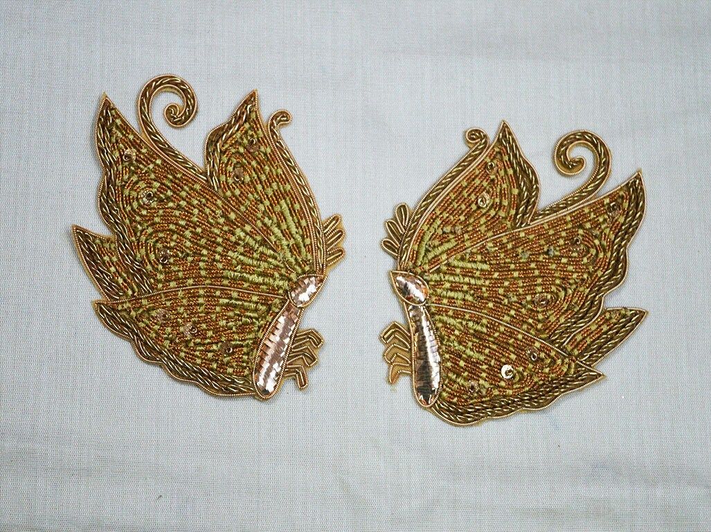 8 Pieces Butterflies Design Appliques in Beige and Gold Color are extremely beautiful applique (sew on applique or you can paste it with fabric) in golden finish which gives the exclusive look. Each of them is decorated with Zardozi work, Thread work to make it a perfect piece for embellishing a wedding dress, Wedding Skirt or a sari.