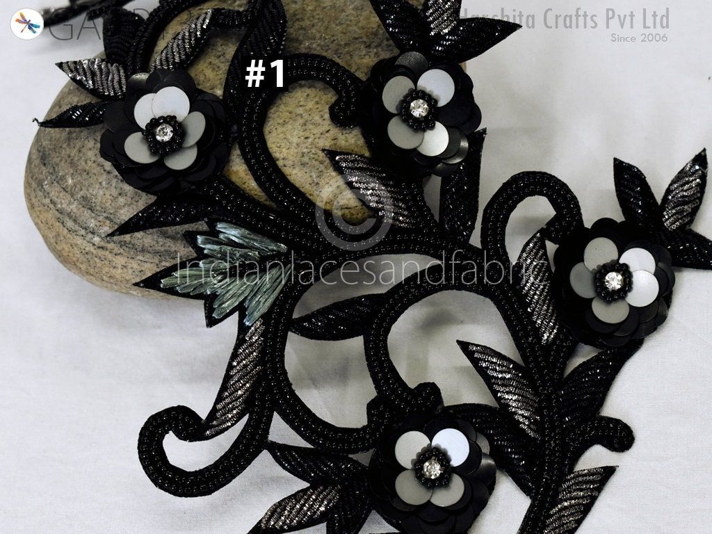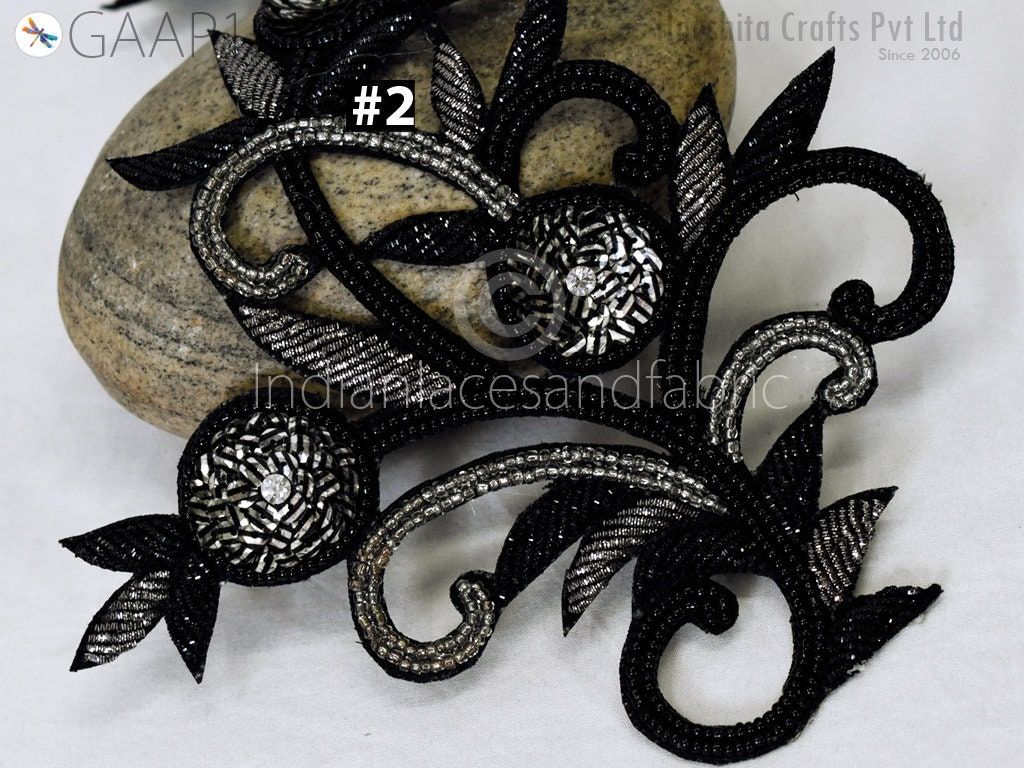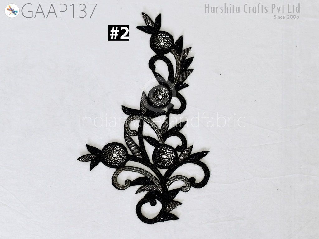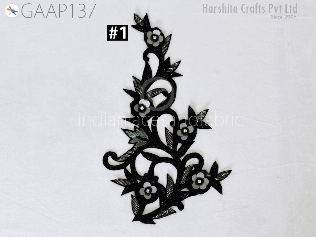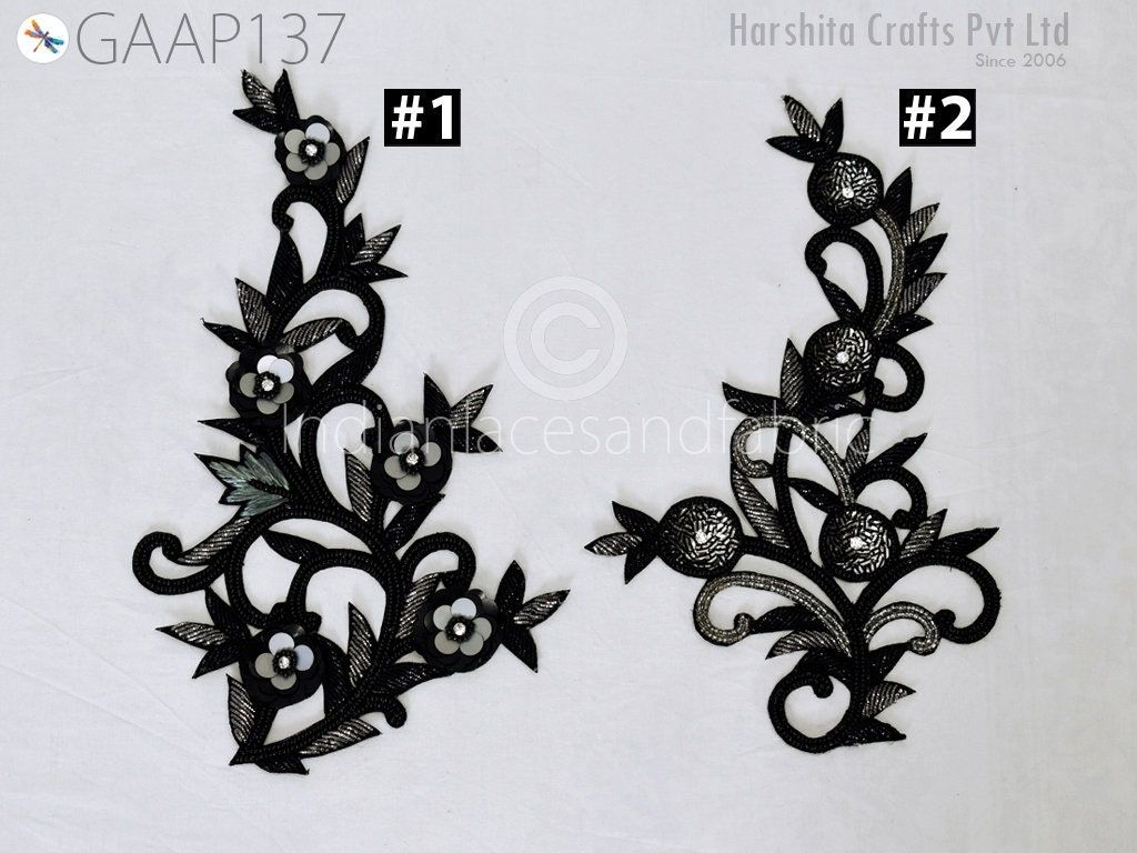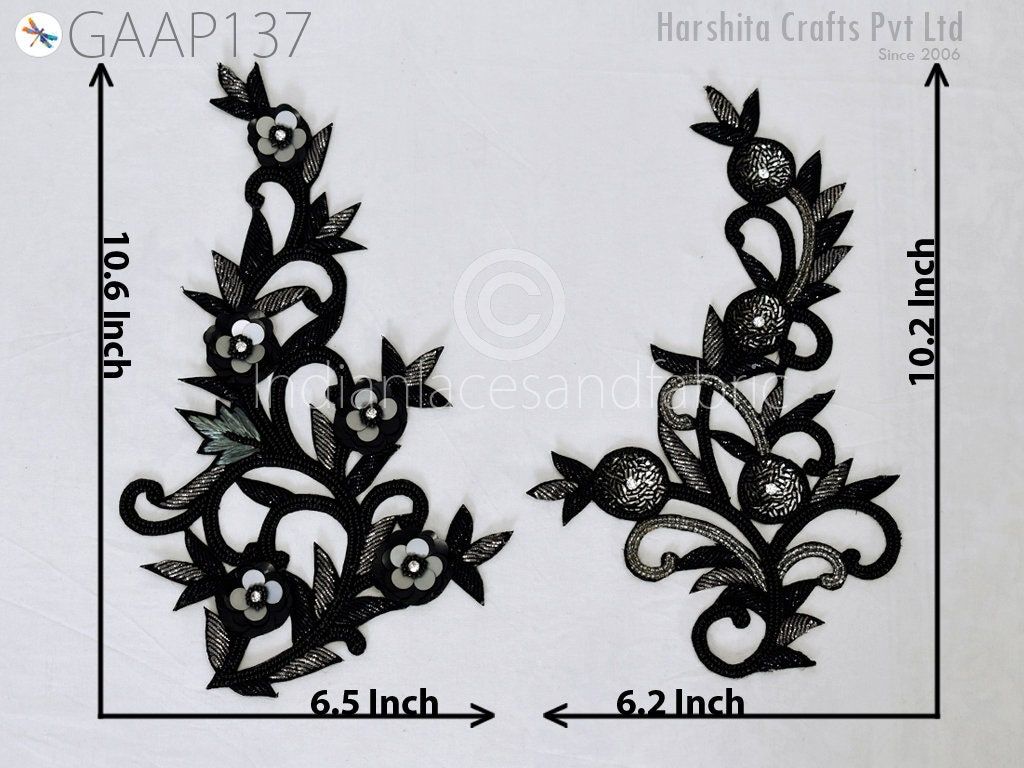 2 Piece Floral Design Appliques are extremely beautiful applique (sew on applique or you can paste it with fabric) in Black and Grey finish which gives the exclusive look. Each of them is decorated with bugle beads, Sequins work to make it a perfect piece for embellishing a wedding dress, Wedding Skirt or a sari.