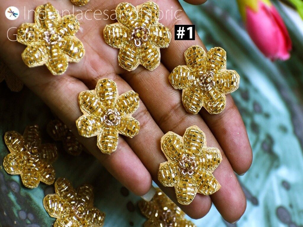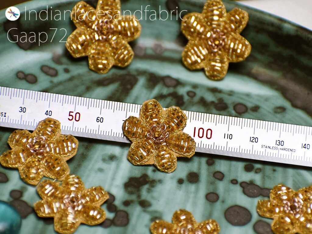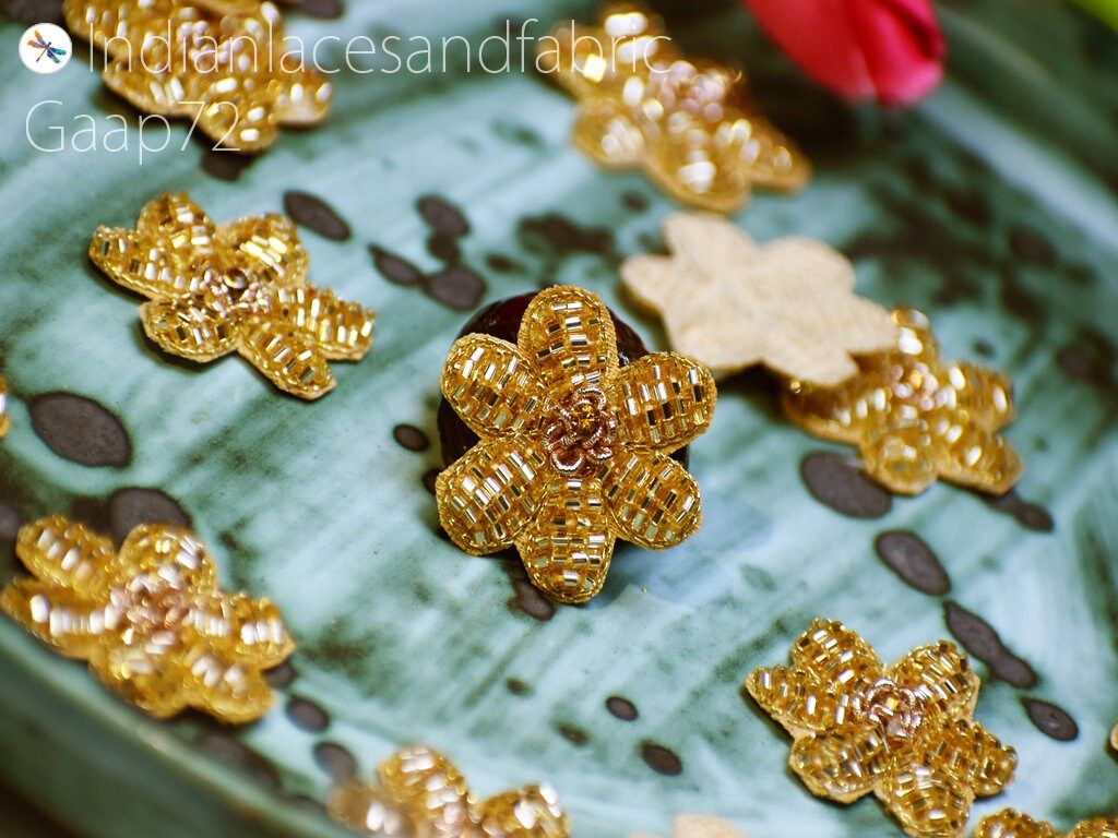40 Pc Indian Handcrafted Applique Decorative Golden Sewing Handmade Patches Beaded Bridal Headband DIY Crafting Home Decor Cushion Covers, Bridal Clutches patches, garments accessories, Decorative appliques
