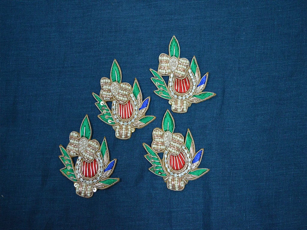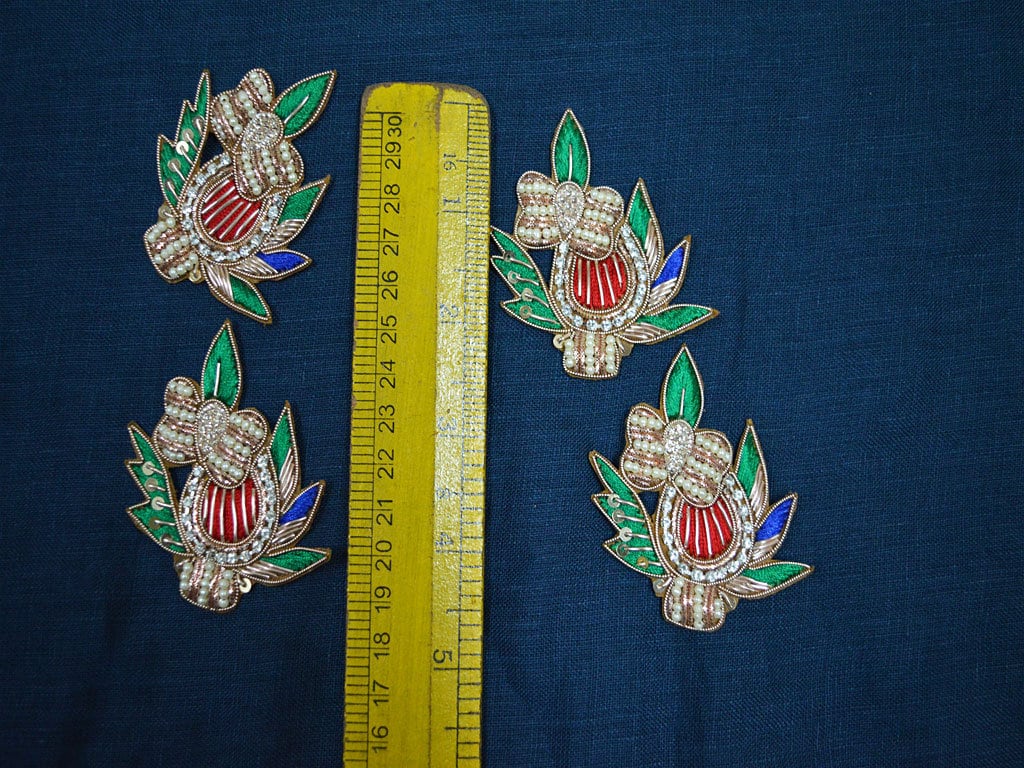 8 Floral Motif Design Appliques in red, green, blue, gold color are extremely beautiful applique (sew on applique or you can paste it with fabric glue) in golden finish which gives the exclusive look. Each of them is decorated with Zardozi work, mirror, Silk Thread work to make it a perfect piece for embellishing a wedding dress, Wedding Skirt or a sari.