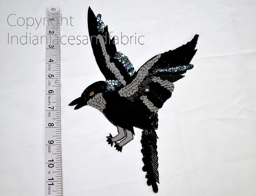Elevate your creative projects with this stunning eagle motif applique, handcrafted with intricate embroidery and adorned with shimmering sequins and beads. Featuring a majestic flying eagle in elegant black and grey tones, this applique adds a bold, dynamic flair to garments, accessories, and decor.