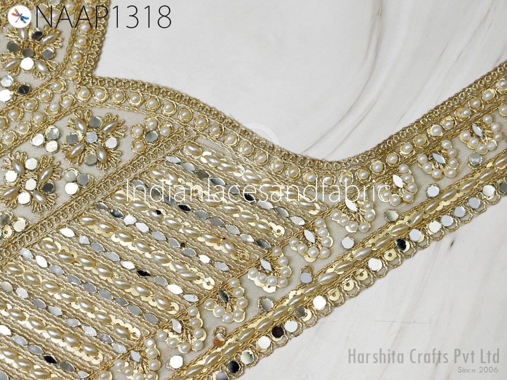 Embroidered Gold Neckline Applique: Pearl & Mirror Indian Patch