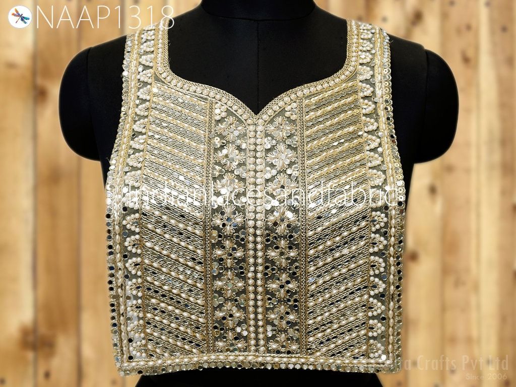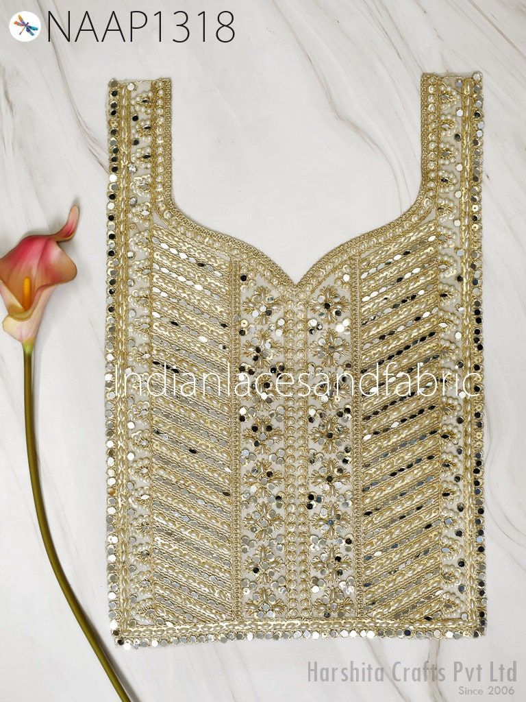 A perfect embellishment for a bridal dresses or for festive mood outfit a sequin Neckline. Our Sequin Gold patches will add mystique to your fabric, you can use this Neck Patch alone or add it with other laces to create a new unique design for your dress.