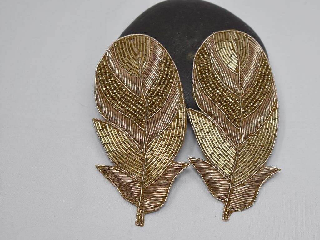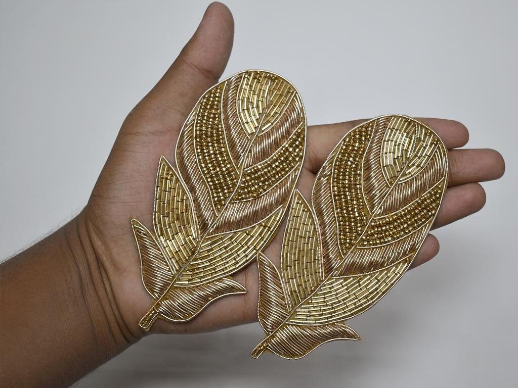 4 Piece Gold Handmade Feather Patches for Cushion Covers Hat Embroidered Indian Sewing Dresses Handcrafted Beaded Patches Appliques Crafting, Feather Indian Patches Appliques, Christmas applique, Applique for dress, Headband Applique, applique designs, Handcrafted Appliques, Scrap booking Appliques
