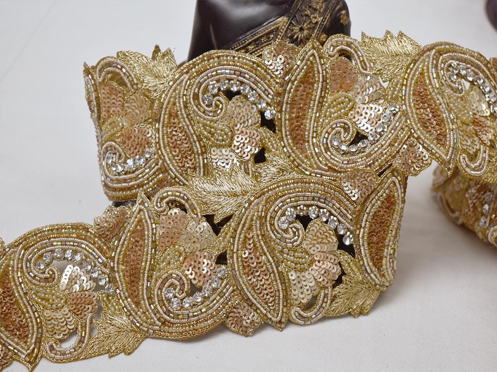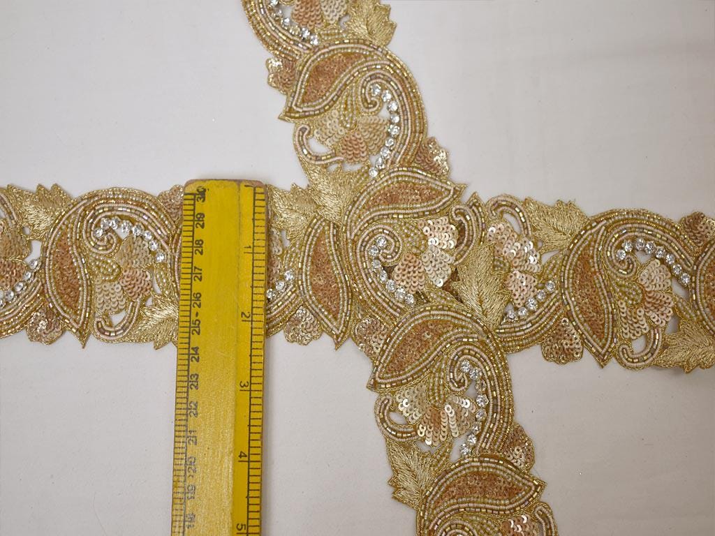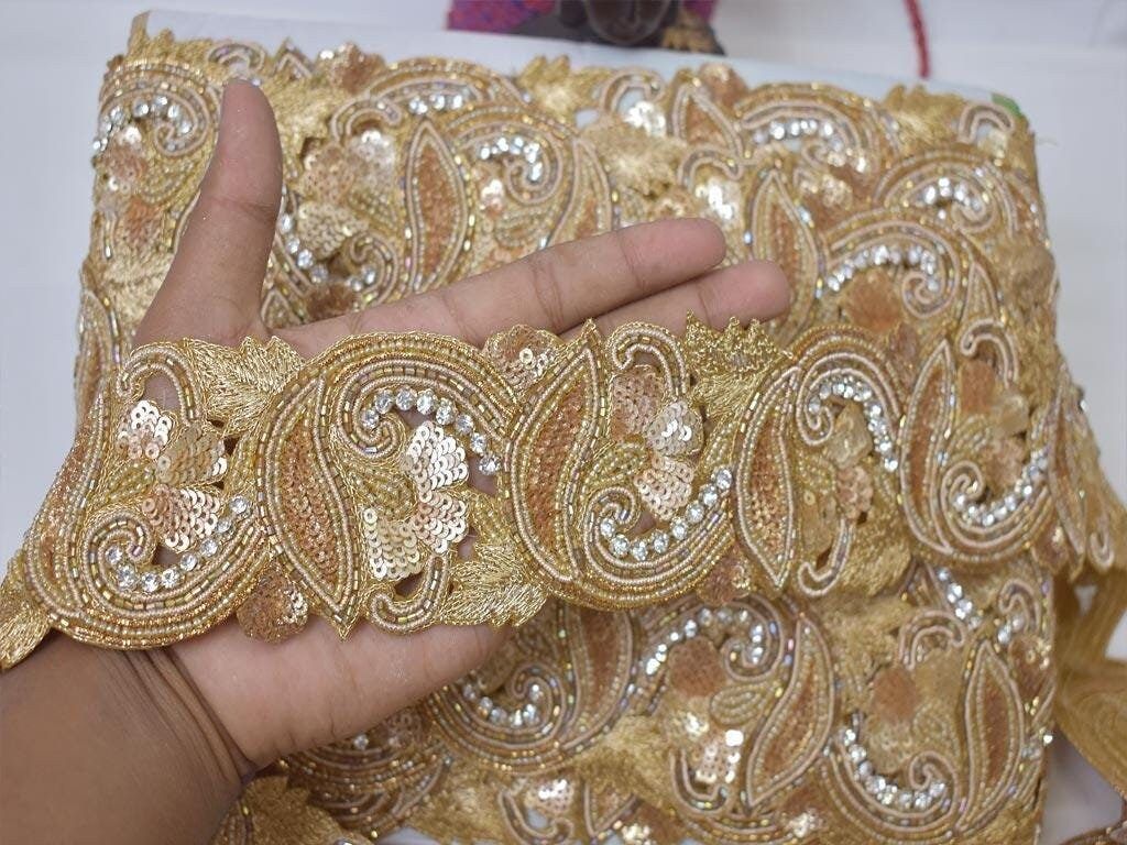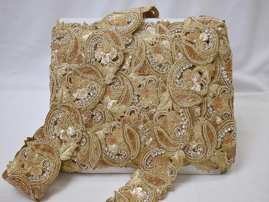 This is exclusive Dull Gold Indian beaded trim with sequin, has been Hand Embroidered is a perfect Embellishment for a Bridal dresses or for festive mood outfit a Zari Work Lace. Our Gold Finish Trims will add mystique to your fabric, you can use this lace alone or add it with other laces to create a new unique design for Wedding dress.