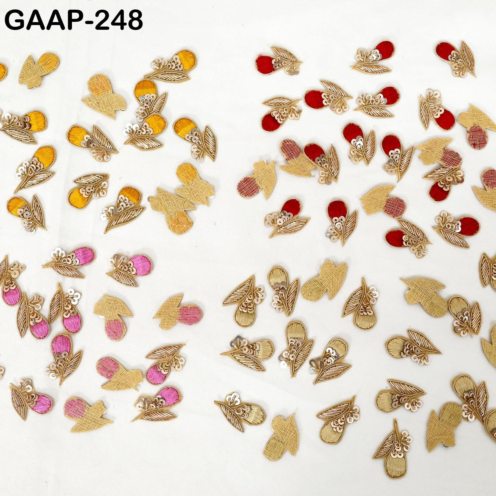 These handcrafted zardozi with thread work patches in gold, red, yellow, pink and beige bring a festive, traditional sparkle to any project. Each piece is carefully made with gold zari and contrasting silk thread perfect for ethnic wear customization and creative craft ideas.
