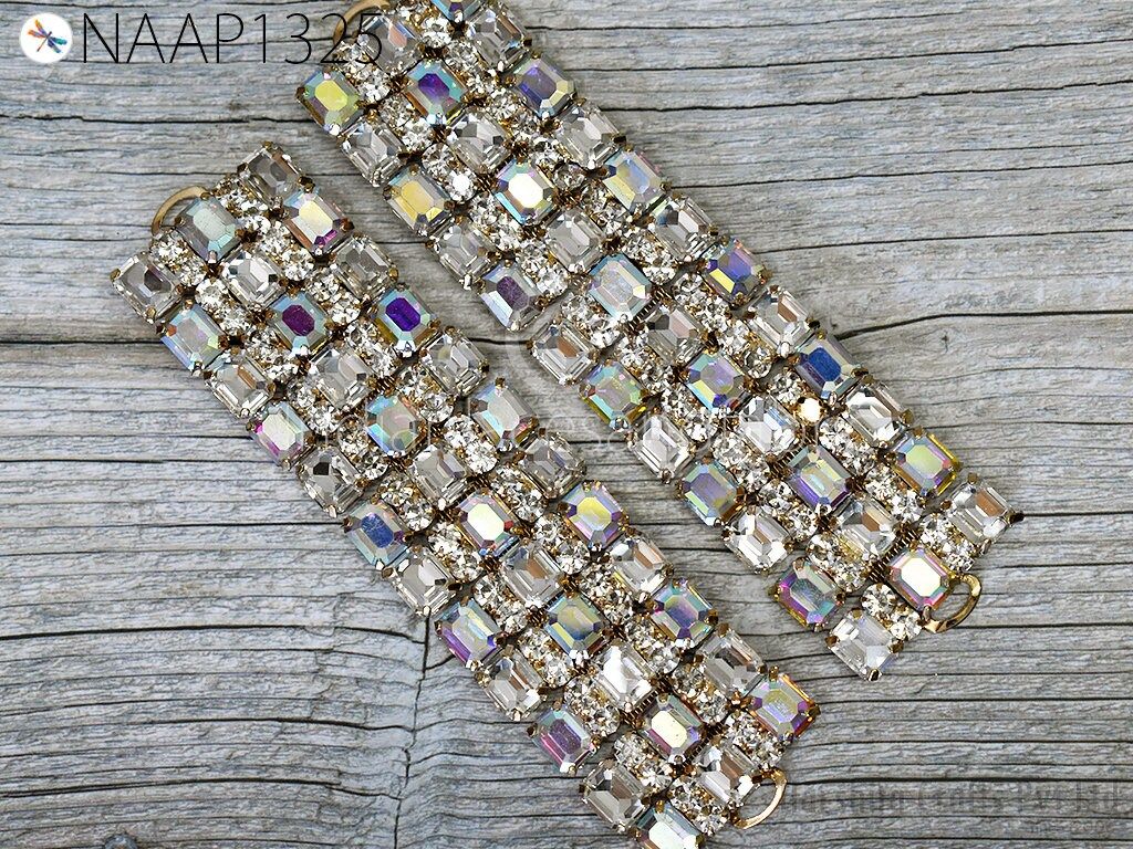 Indian Patches Appliques extremely beautiful sew on applique. Rhinestone applique made of magnificent glass and acrylic set on metal setting. Each stone is soldered together to create this wonderful piece. Perfect to use as a centerpiece or accent for your costume. The back part is not flat and should not be applied directly on delicate materials like chiffon or sheer fabric.