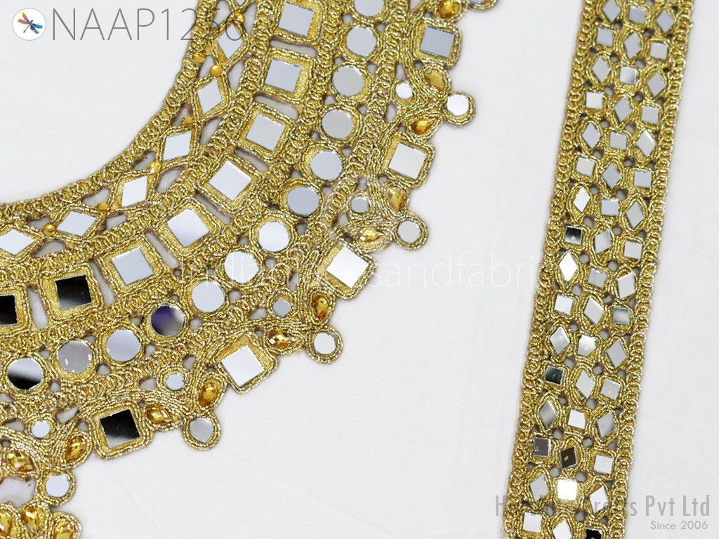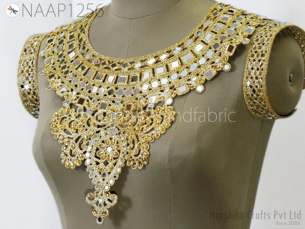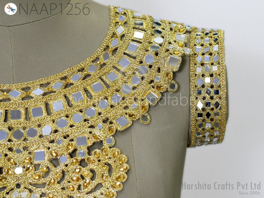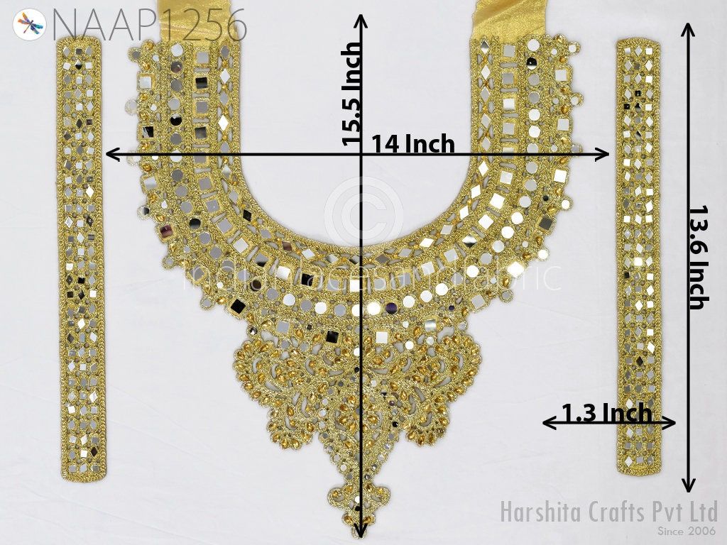 This is exclusive metallic thread embroidered Neckline Patches (Handcrafted Zardozi), has been hand embroidered. Zardozi Neck is an ancient art of sewing gold threads onto the fabric to create extraordinary patterns, giving it a rich look to a bridal dress or classy dress.