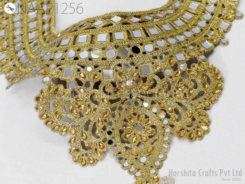 A perfect embellishment for a bridal dresses or for festive mood outfit a Zardosi Work Neckline Patch. Our Zardozi Gold Patch will add mystique to your fabric, you can use this Patch alone or add it with other laces to create a new unique design for Wedding Dress.