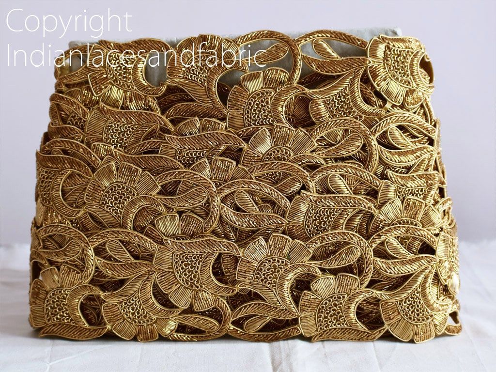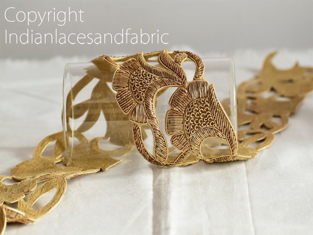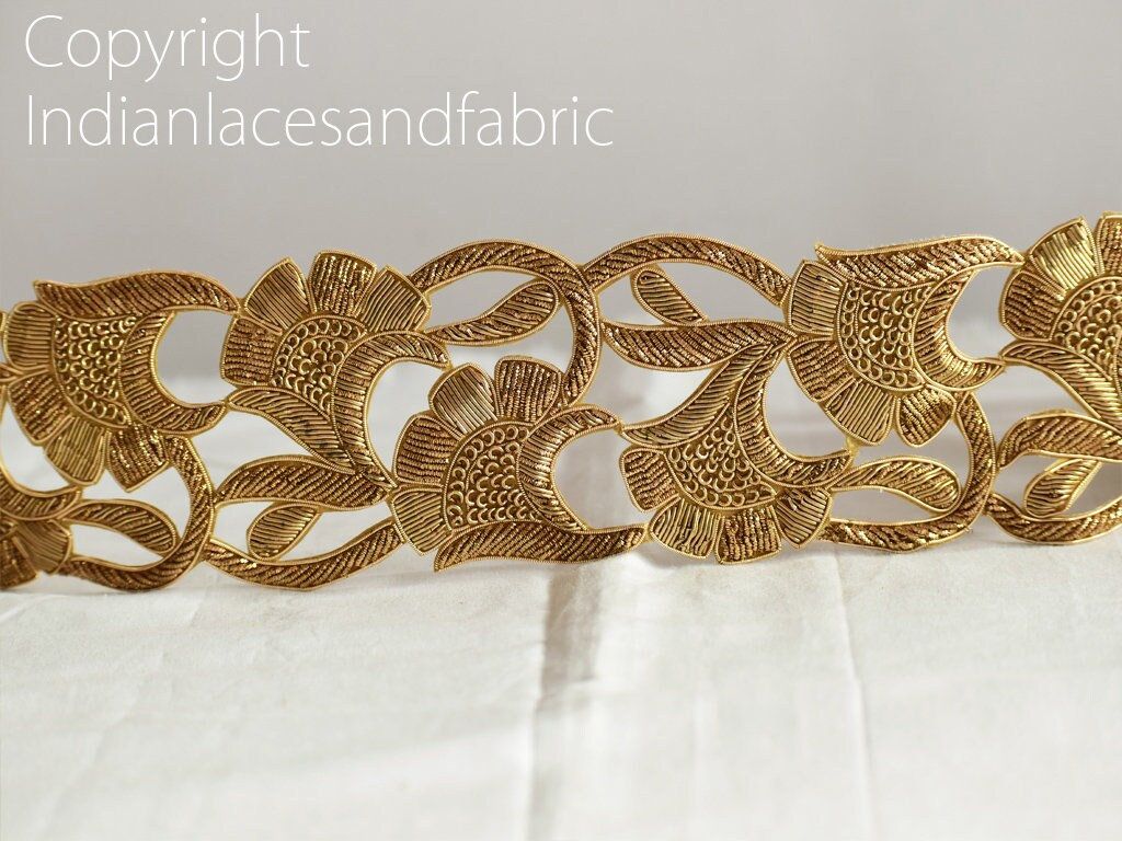 This is exclusive metallic thread embroidered trim (Handcrafted zardozi, has been hand embroidered. This beautiful Lace can be used for Occasional apparels, Bags decoration, fashion blog, Cushion Cover, Bridal Clutches, Christmas Décor, Wedding gown, Etc.