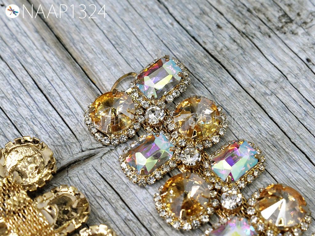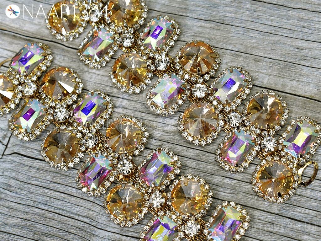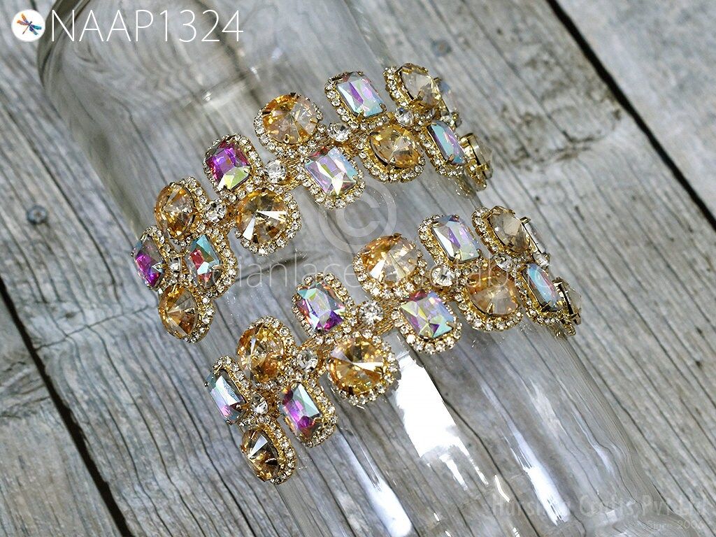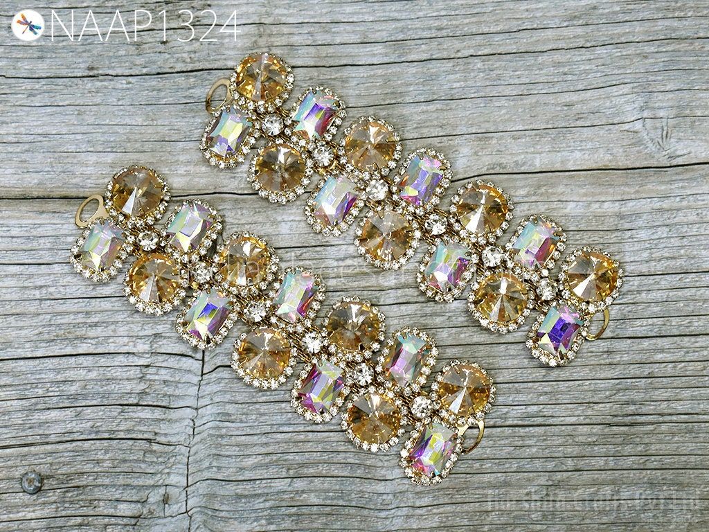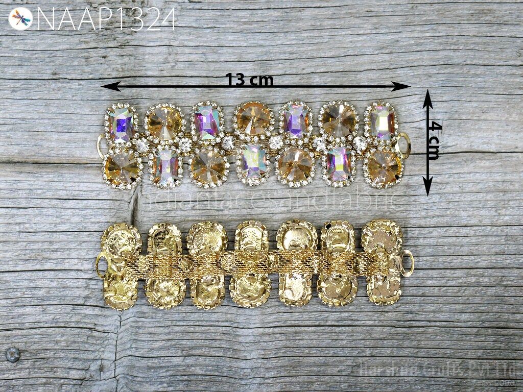 Indian Rhinestone Appliques are extremely beautiful Sew on applique Crystal applique made of magnificent Glass and Acrylic set on metal setting. Each stone is soldered together to create this wonderful piece. Perfect to use as a centerpiece or accent for your costume. The back part is not flat and should not be applied directly on delicate materials like chiffon or sheer fabric.