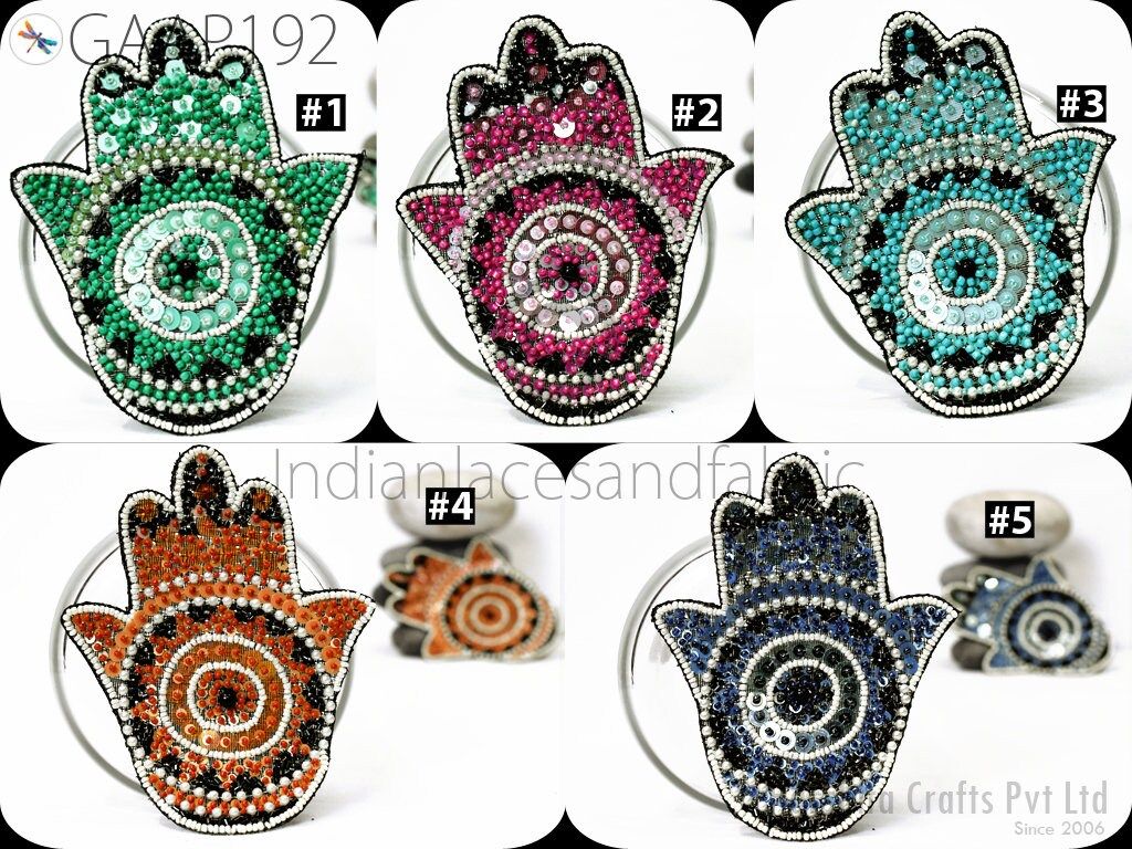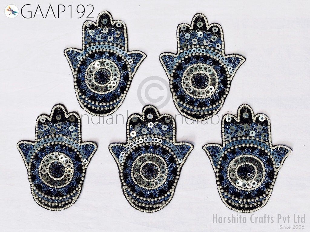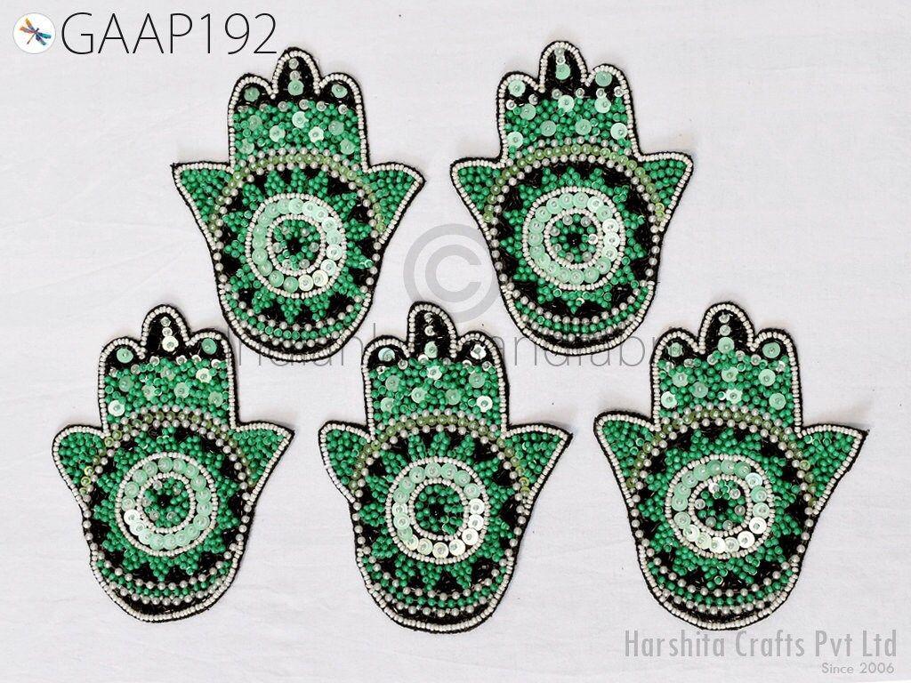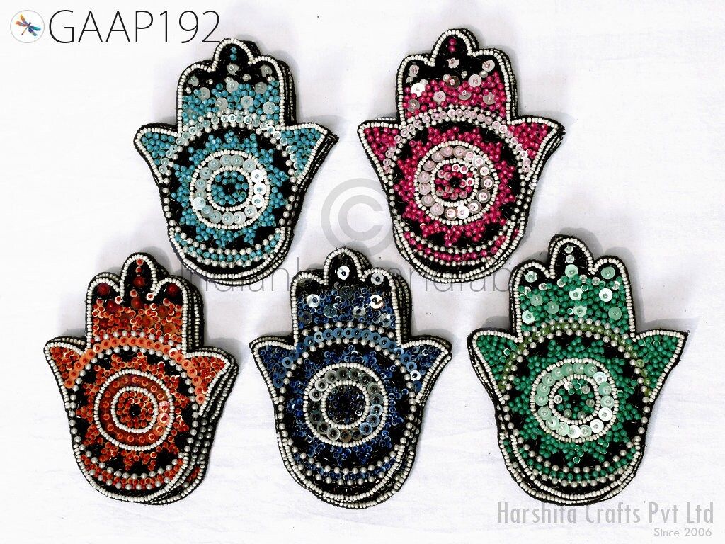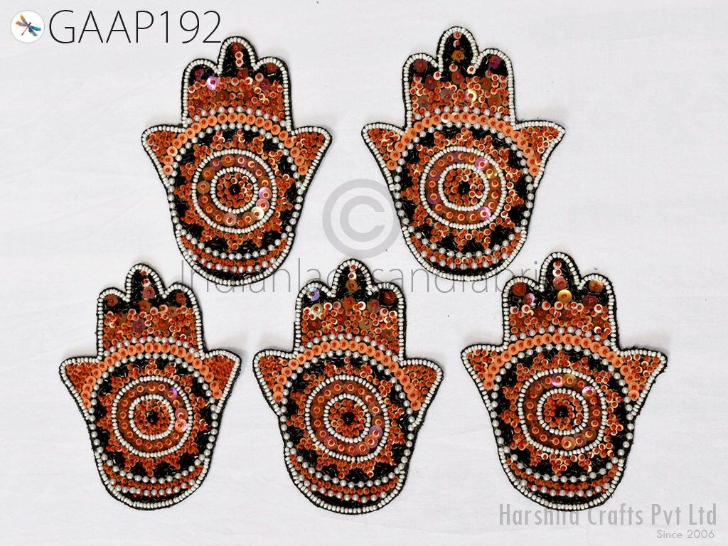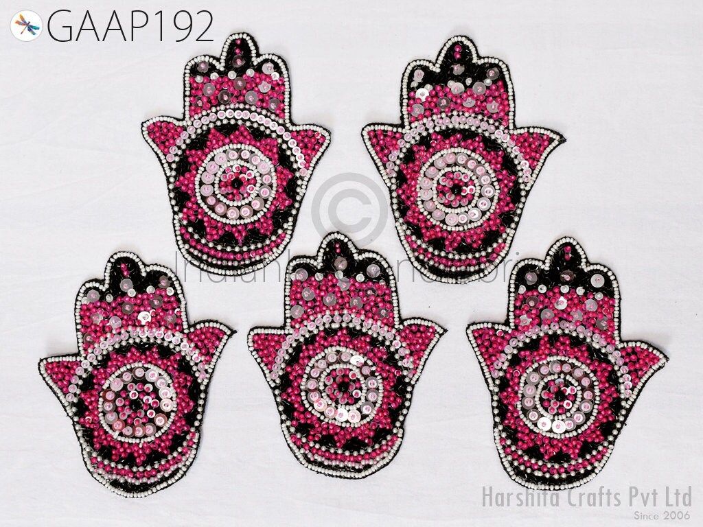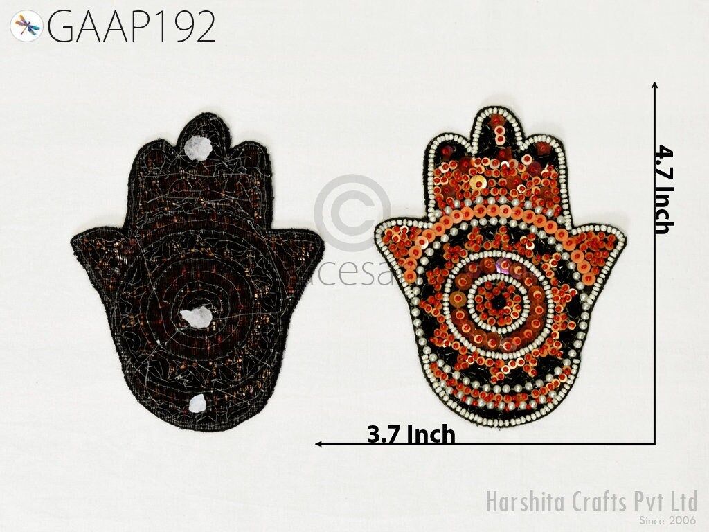 Exquisite 4 Pieces Hamsa Hand Palm Indian Appliques are hand sewing applique, each of them is decorated with beads, sequins with Thread work and are perfect for a variety of sewing and craft projects,DIY crafts, Dresses, Ceremonial dresses, Christmas celebrations, designing Fashion costumes, home decoration, Scrap booking, Weddings, Events etc. This handmade patch makes the perfect gift for fashion lovers and anyone looking to showcase their unique style with one-of-a-kind accessories.