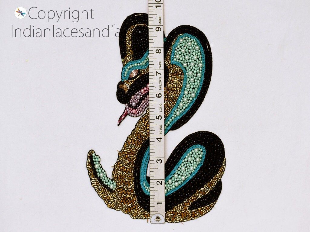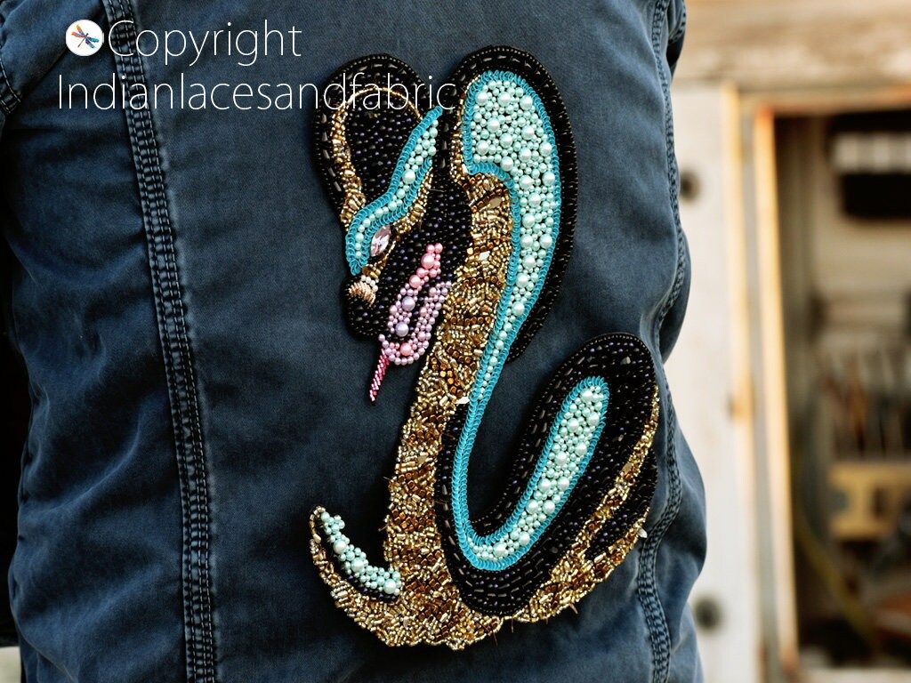 Cobra Snake Patch for Denim Jackets are extremely beautiful applique (sew on applique or you can paste it with fabric) in Embroidery which gives the exclusive look. Each of them is decorated beaded with Thread work to make it a perfect piece for embellishing a wedding dress, Wedding Skirt or a sari.