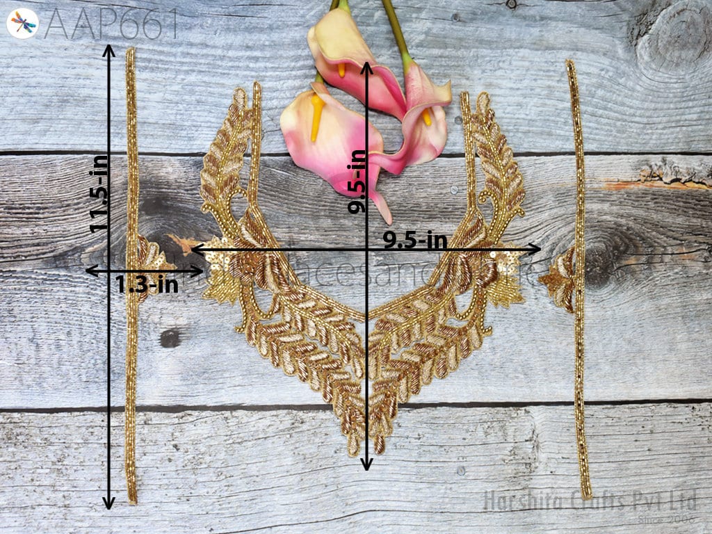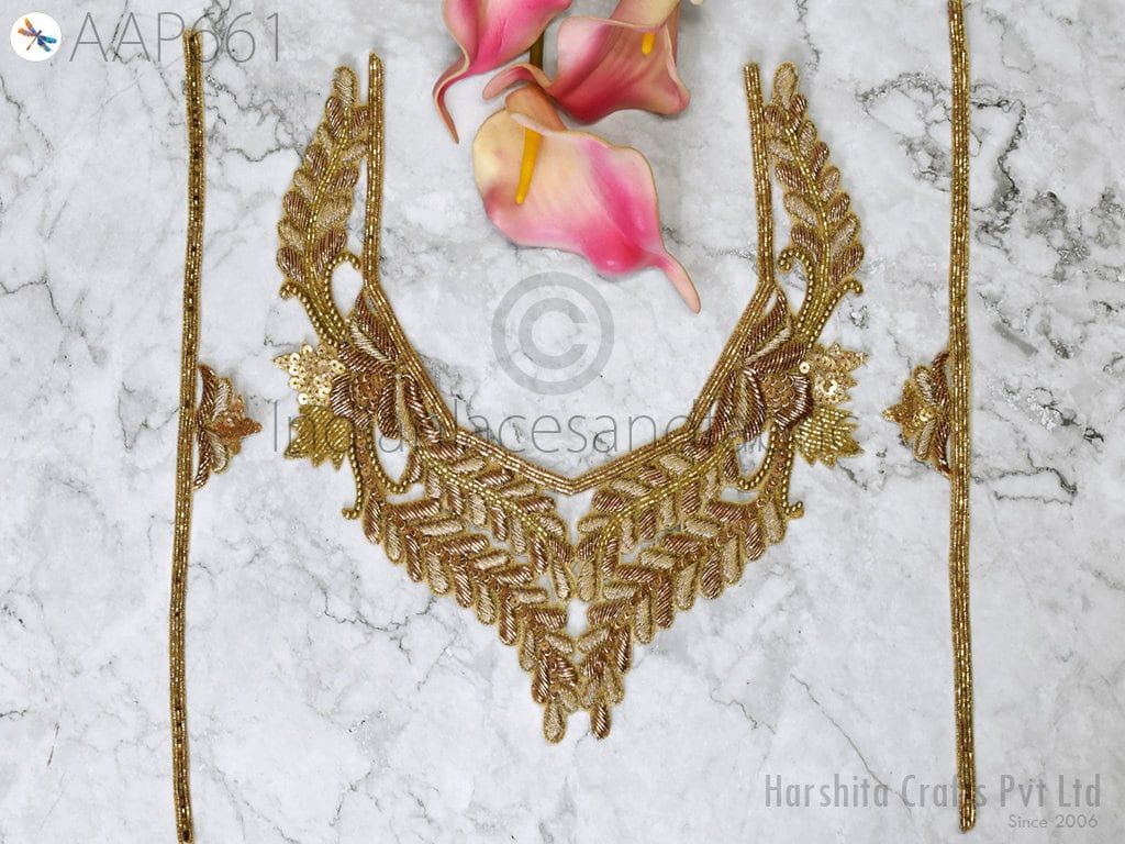 Embroidered Applique Decorative Patches Crafting Ribbon Handcrafted Zardosi Gold Neck Patches with Sleeves Neckline Patches Indian Decorated, Neckline Zari Patches, Neckline Applique, Zari Shoulder.