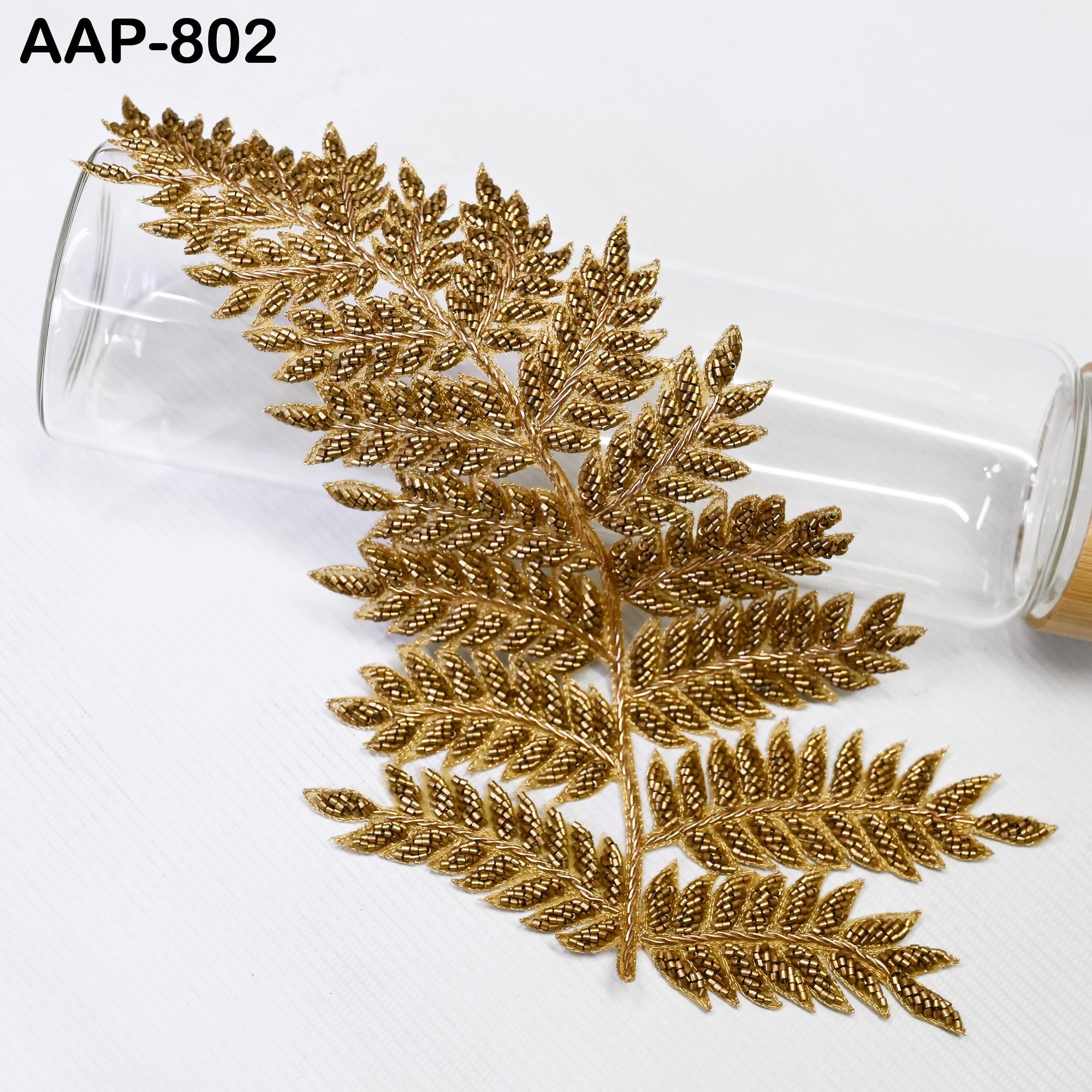 Add a touch of luxury and elegance to your creations with this Handmade Gold Leaf Embroidered Applique. Crafted using traditional Indian Zari embroidery techniques, this beaded fern design exudes sophistication and charm.