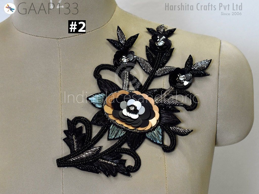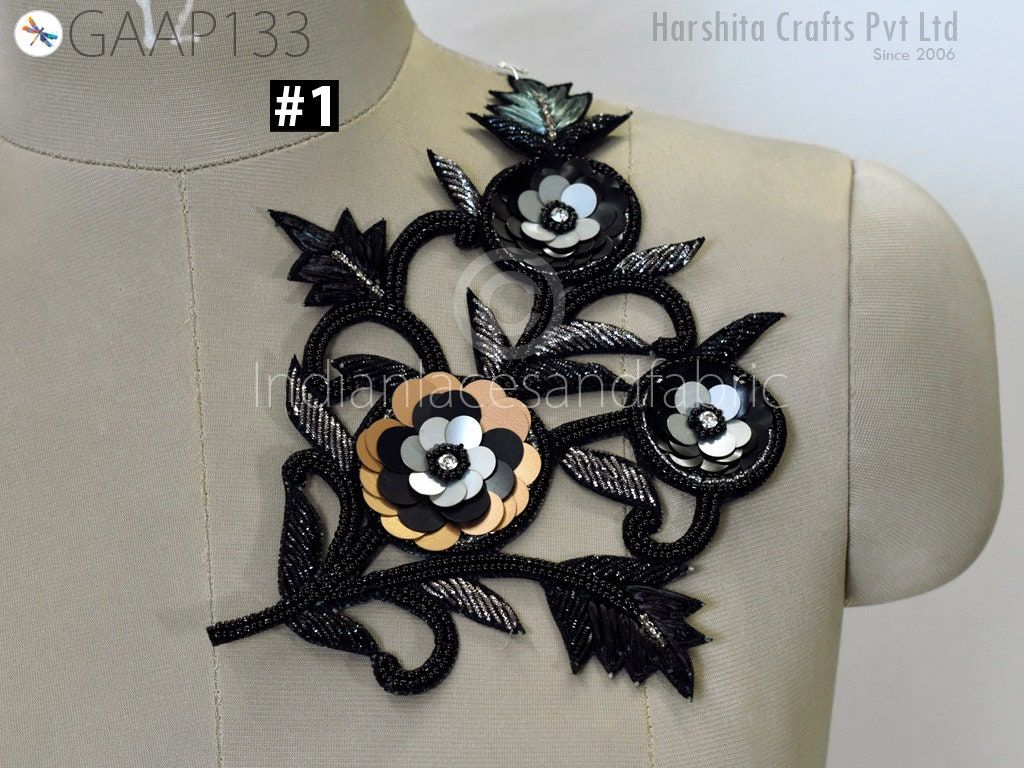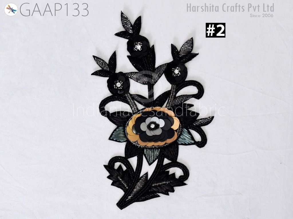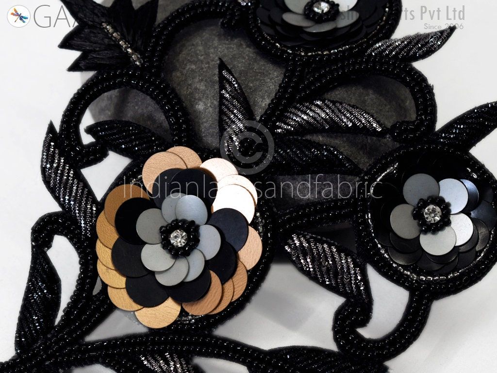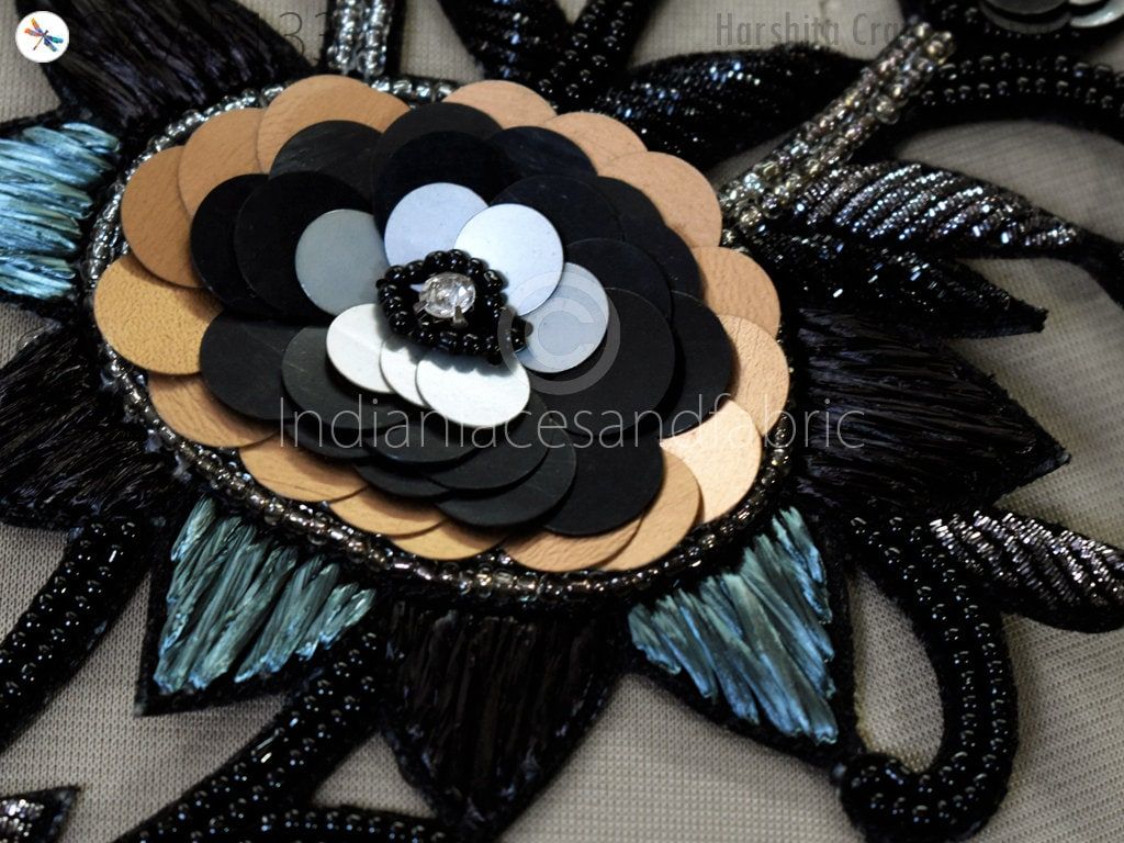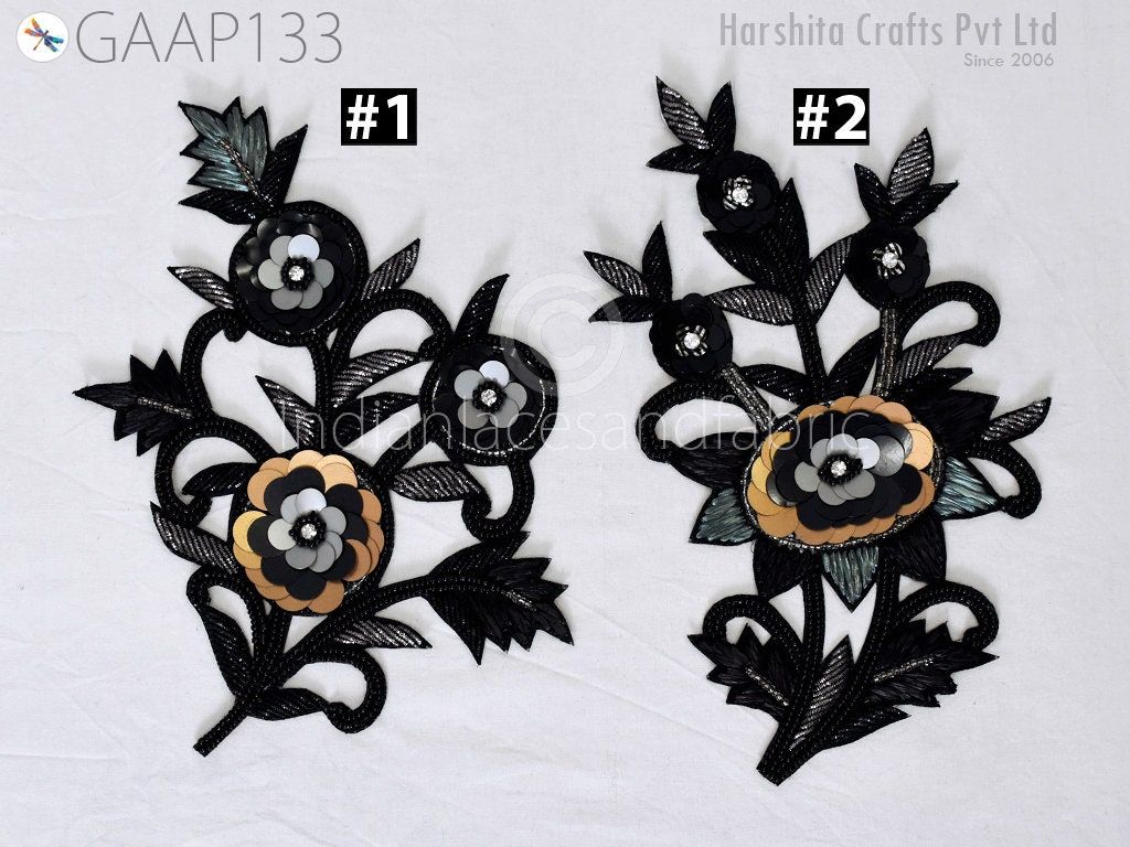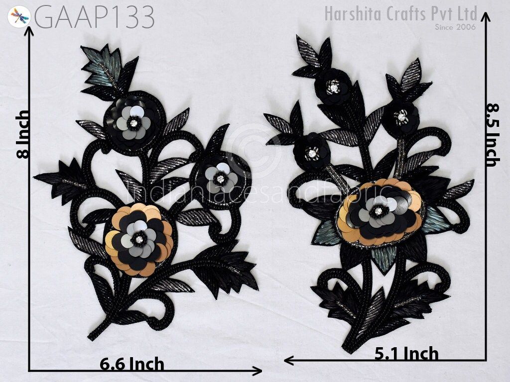 1 Piece Floral Design Appliques are extremely beautiful applique (sew on applique or you can paste it with fabric) in Black and Grey finish which gives the exclusive look. Each of them is decorated with bugle beads, Sequins work to make it a perfect piece for embellishing a wedding dress, Wedding Skirt or a sari.