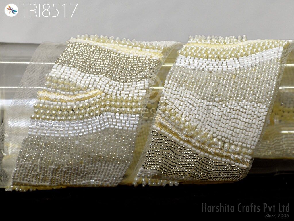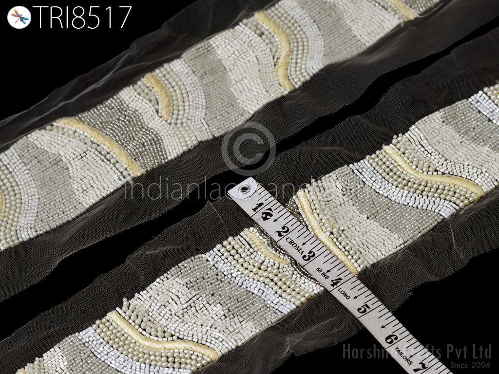 Ivory Beaded Trim By The Yard Handmade Bridal Belt Sashes Wedding Dress Trimming Costume Embellishment Tapes DIY Crafting Sewing Sari Border