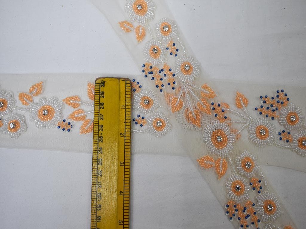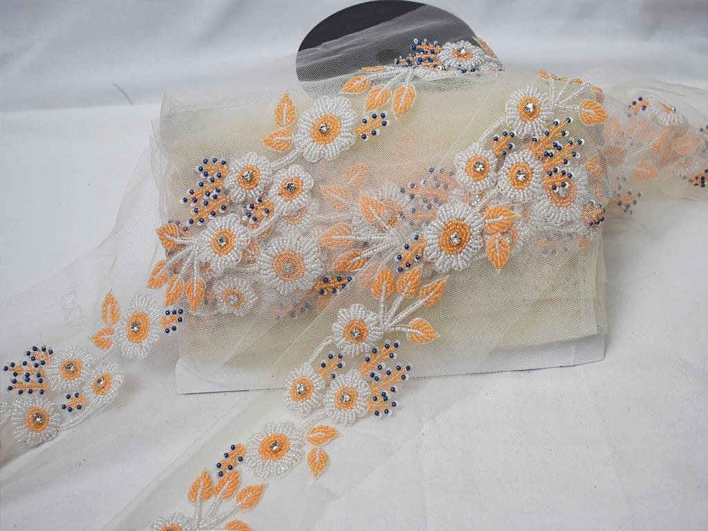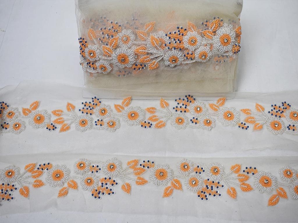 Orange Beaded Floral Trim: Handcrafted Sari Border, Bridal Embellishment