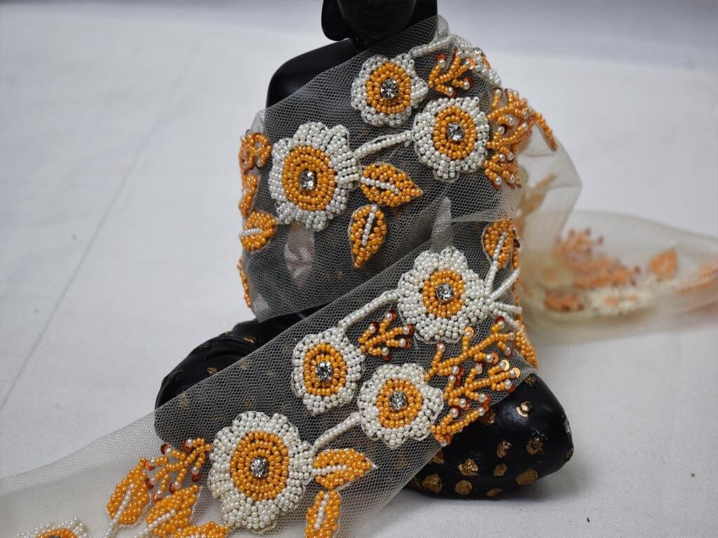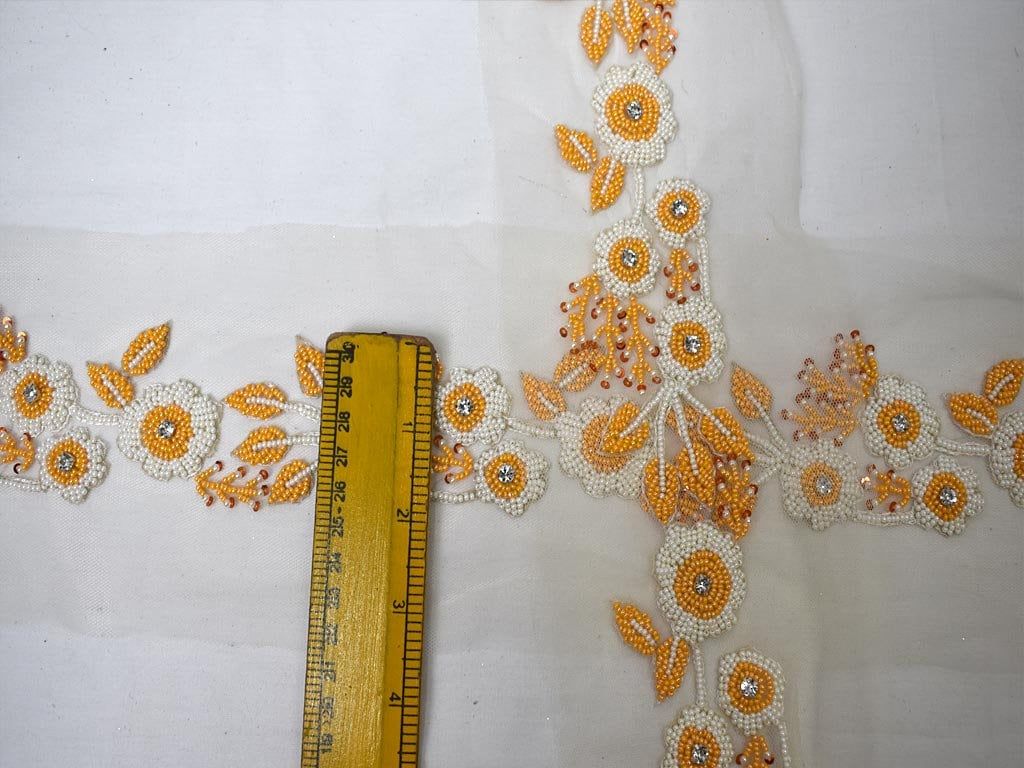 This Handcrafted White and Orange Beaded Trim, has been hand embroidered. This Indian Handmade beautiful Lace can be used for headbands, table runner, curtains, Table cover, salwar kameez, DIY belt, Wall Hanging, Art Quilt etc.
