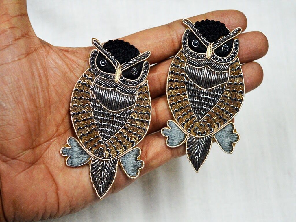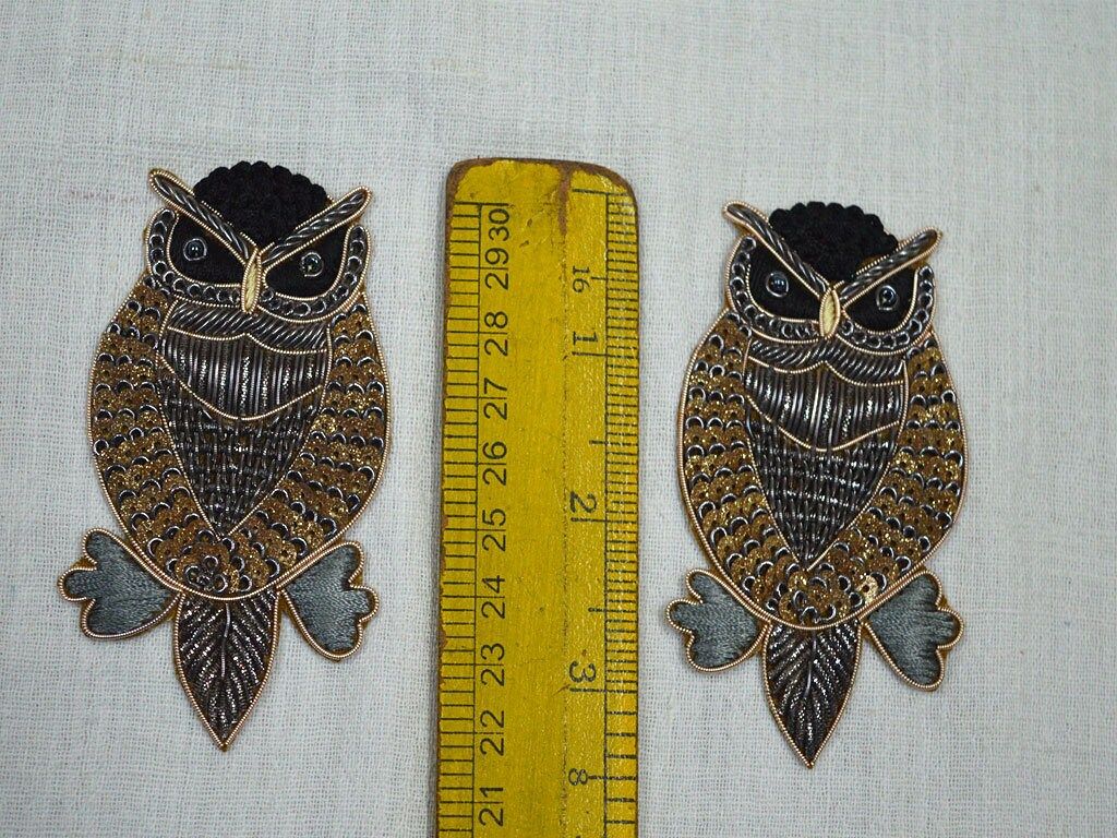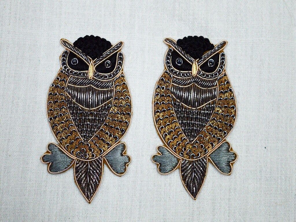 4 Pieces (2 Pair) Owl Bird Appliques are extremely beautiful applique (sew on applique or you can paste it with fabric) in golden finish which gives the exclusive look. Each of them is decorated with Zardozi work, Silk Thread work to make it a perfect piece for embellishing a dress, Denims, Jacket Skirt or a sari Blouse