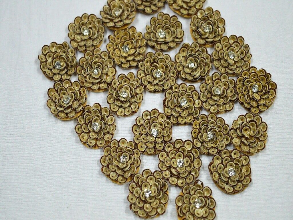 Rhinestone Flower Appliques: Golden Wood Finish, Hand Embroidered Indian Patches (50 Pieces)