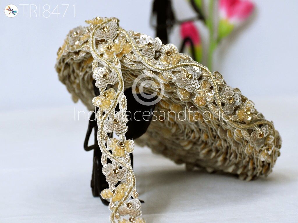 Trim by 3 Yards Handmade | Sequin Zardozi Wedding Dress lace | Costume Indian Floral Sari Border | DIY Craft Saree Ribbon Zari Tape Trimming, Decorative Trim, Dresses Trim, Costume Tape, Sari Lace