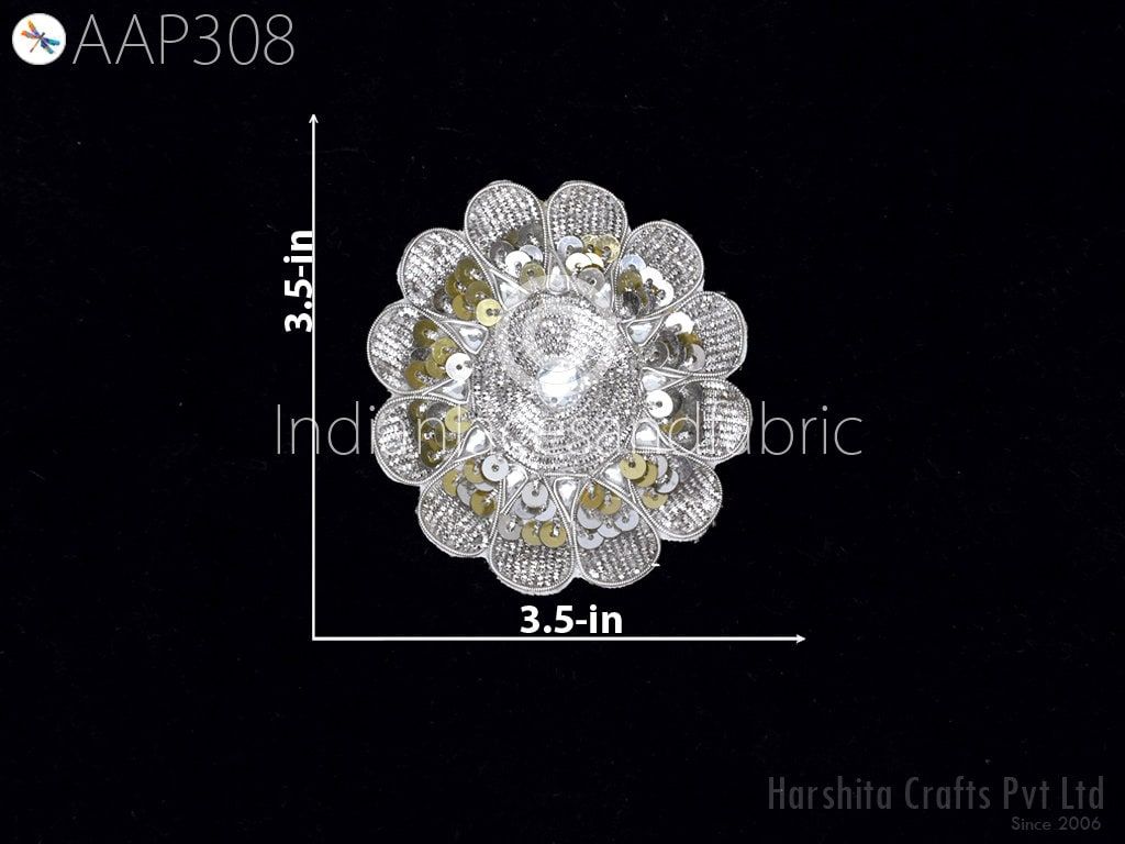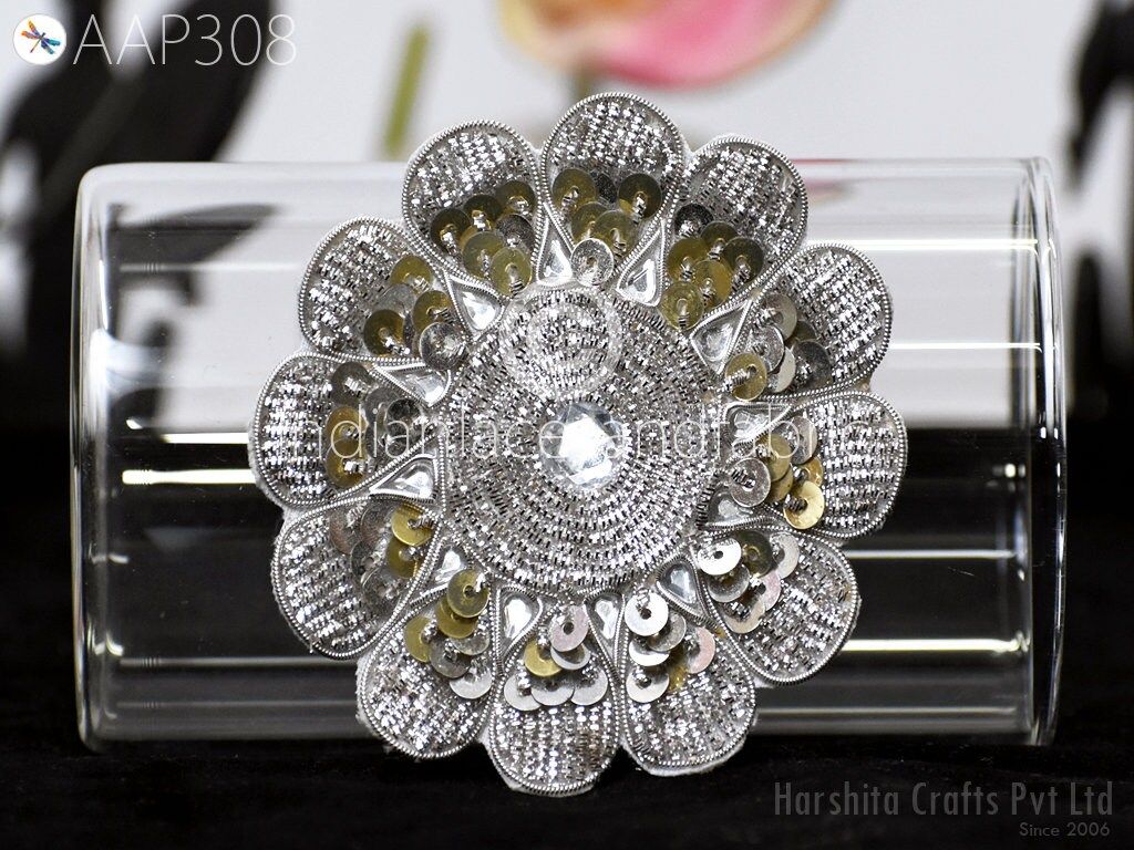 6 Piece (3 Pair) Mandala Design Appliques are extremely beautiful applique (sew on applique or you can paste it with fabric) in Silver finish which gives the exclusive look. Each of them is decorated with Zardozi work, Silk Thread work to make it a perfect piece for embellishing a wedding dress, Wedding Skirt or a sari.