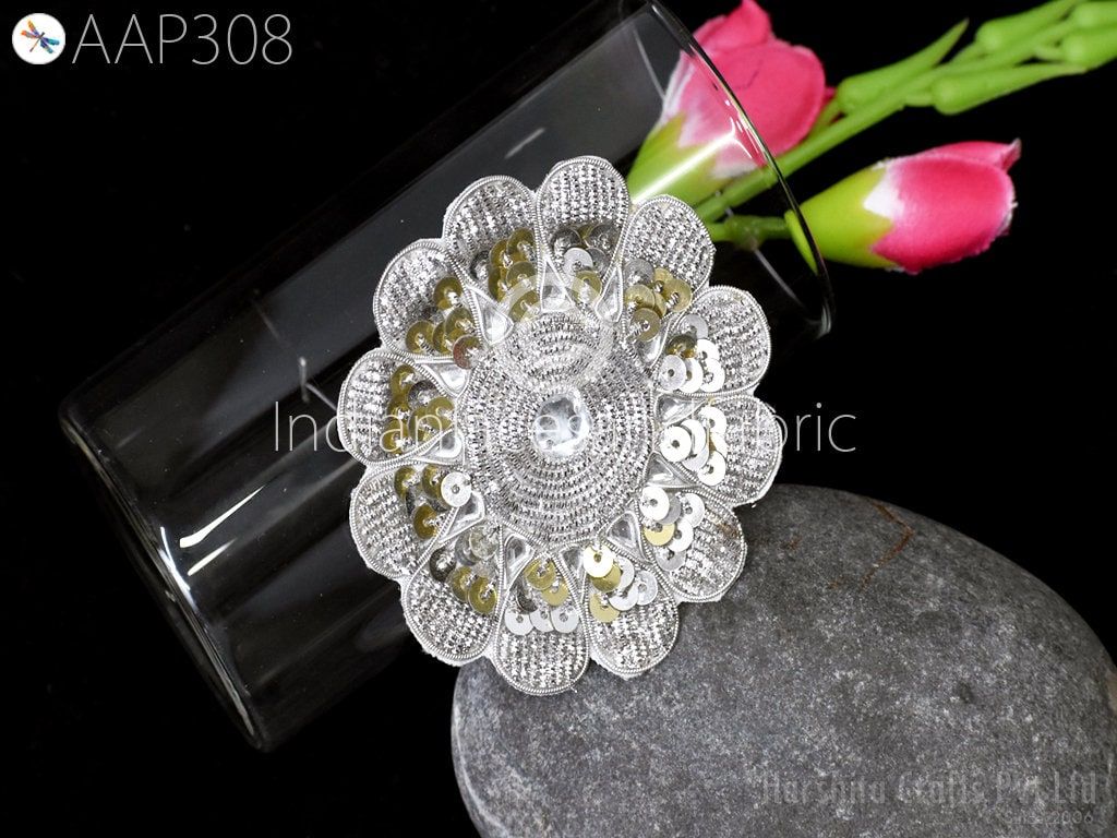 Silver Mandala Appliques: Beaded Indian Dress Patches (Set of 6)