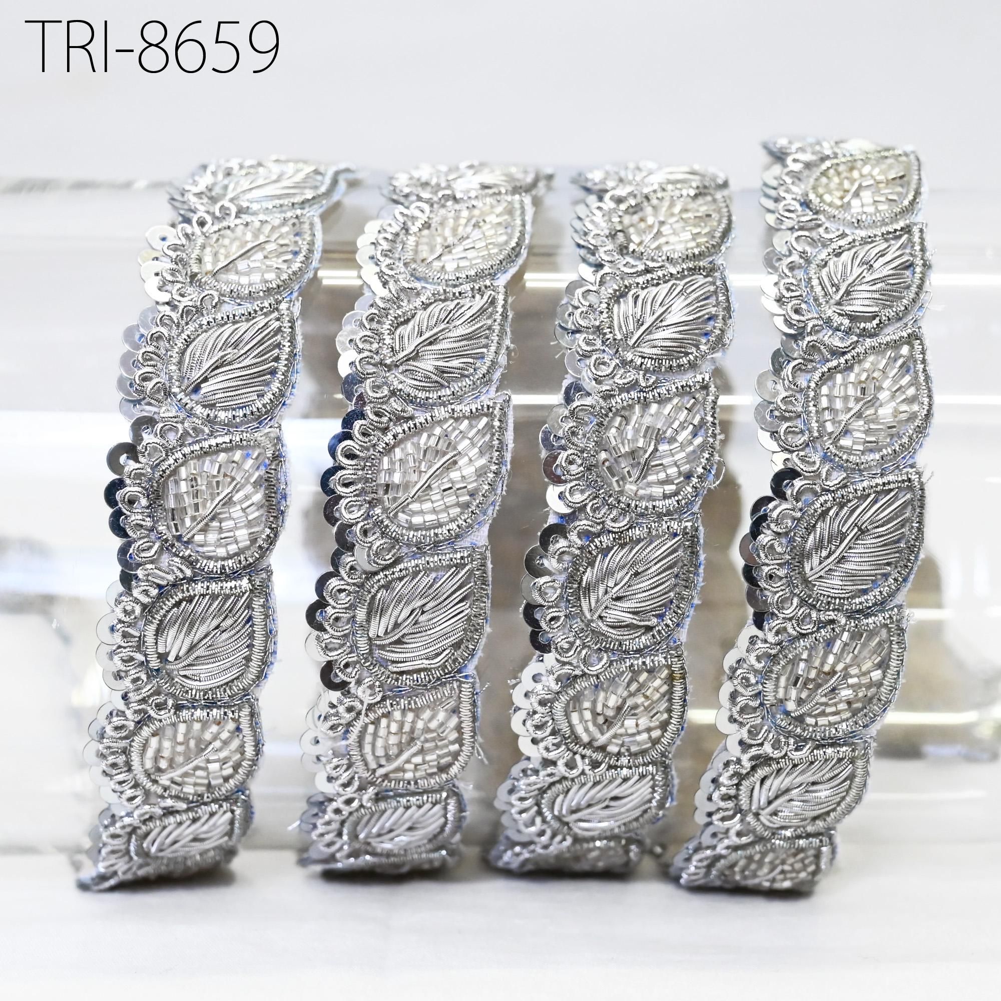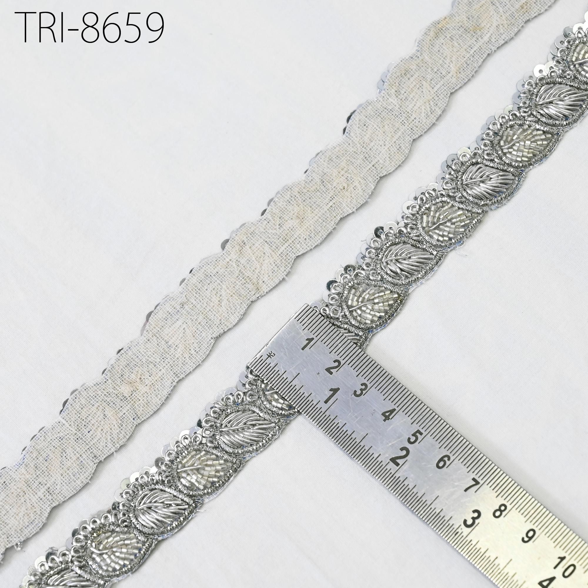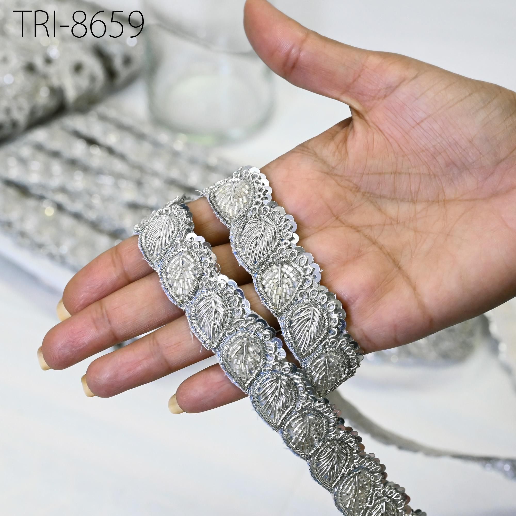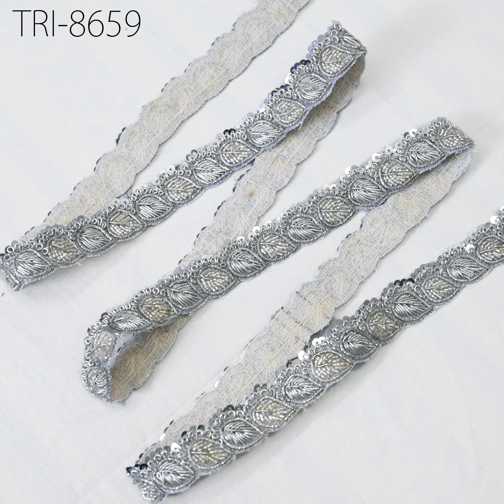 3 Yards Exclusive Silver finish Zari, cut beads and metallic thread embroidered Trim 1 Inch trim, a perfect embellishment for a bridal dresses or for festive mood outfit a Zari Work Lace. Our Zardozi Gold Trims will add mystique to your fabric, you can use this lace alone or add it with other laces to create a new unique design for Wedding dress.